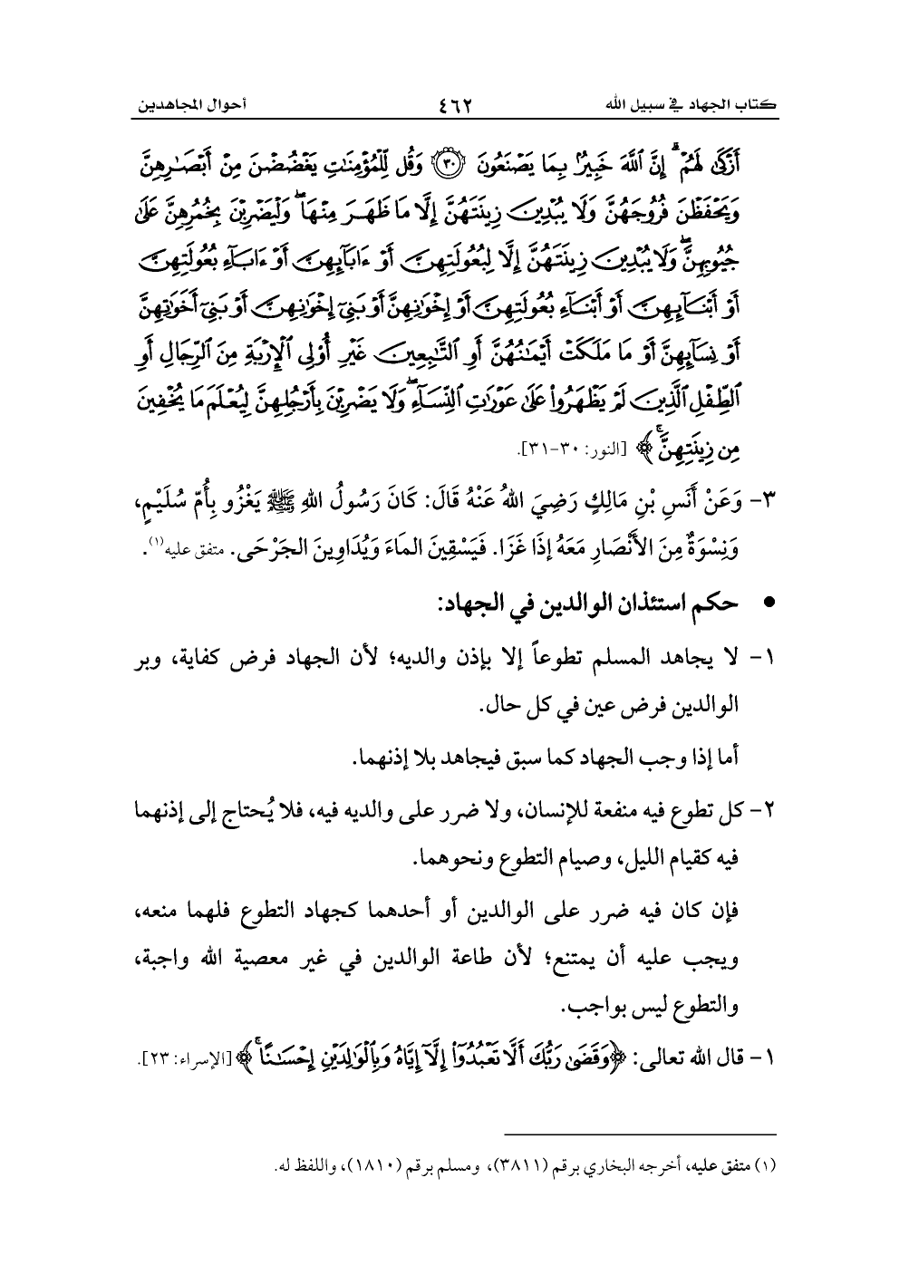 1 - لا يجاهد المسلم تطوعاً إلا بإذن والديه؛ لأن الجهاد فرض كفاية، وبر الوالدين فرض عين في كل حال.