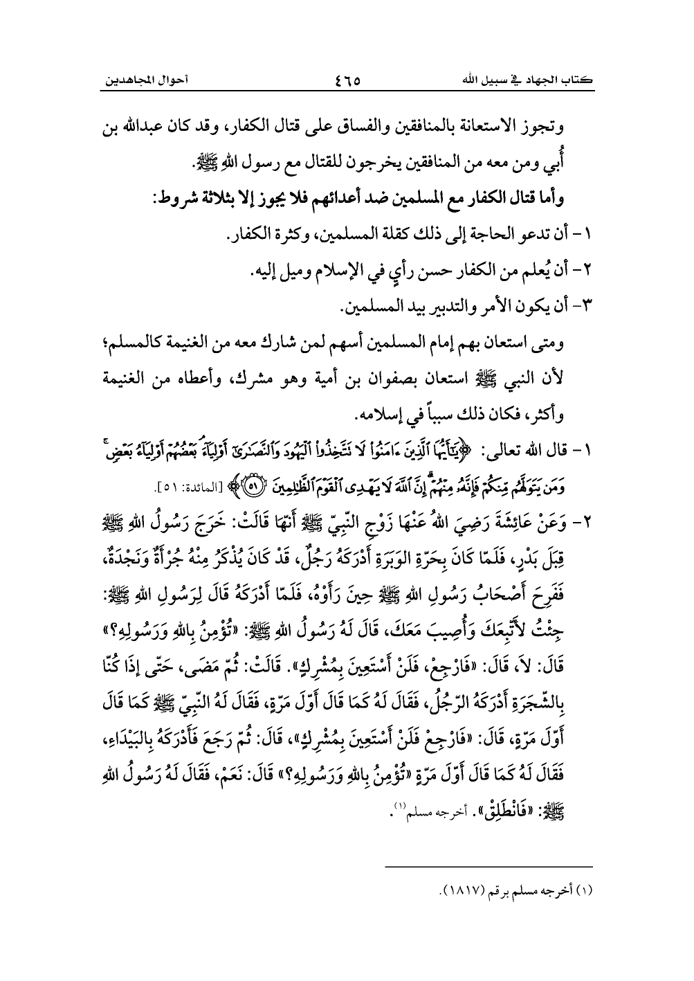 2 - وَعَنْ عَائِشَةَ رَضِيَ اللهُ عَنْهَا زَوْجِ النّبِيّ - صلى الله عليه وسلم - أَنّهَا قَالَتْ: خَرَجَ رَسُولُ اللهِ - صلى الله عليه وسلم - قِبَلَ بَدْرٍ، فَلَمّا كَانَ بِحَرّةِ الوَبَرَةِ أَدْرَكَهُ رَجُلٌ، قَدْ كَانَ يُذْكَرُ مِنْهُ جُرْأَةٌ وَنَجْدَةٌ، فَفَرِحَ أَصْحَابُ رَسُولِ اللهِ - صلى الله عليه وسلم - حِينَ رَأَوْهُ، فَلَمّا أَدْرَكَهُ قَالَ لِرَسُولِ اللهِ - صلى الله عليه وسلم -: جِئْتُ لأَتّبِعَكَ وَأُصِيبَ مَعَكَ، قَالَ لَهُ رَسُولُ اللهِ - صلى الله عليه وسلم -: «تُؤْمِنُ بِاللهِ وَرَسُولِهِ؟» قَالَ: لاَ، قَالَ: «فَارْجِعْ، فَلَنْ أَسْتَعِينَ بِمُشْرِكٍ». قَالَتْ: ثُمّ مَضَى، حَتّى إذَا كُنّا بِالشّجَرَةِ أَدْرَكَهُ الرّجُلُ، فَقَالَ لَهُ كَمَا قَالَ أَوّلَ مَرّةٍ، فَقَالَ لَهُ النّبِيّ - صلى الله عليه وسلم - كَمَا قَالَ أَوّلَ مَرّةٍ، قَالَ: «فَارْجِعْ فَلَنْ أَسْتَعِينَ بِمُشْرِكٍ»، قَالَ: ثُمّ رَجَعَ فَأَدْرَكَهُ بِالبَيْدَاءِ، فَقَالَ لَهُ كَمَا قَالَ أَوّلَ مَرّةٍ «تُؤْمِنُ بِاللهِ وَرَسُولِهِ؟» قَالَ: نَعَمْ، فَقَالَ لَهُ رَسُولُ اللهِ - صلى الله عليه وسلم -: «فَانْطَلِقْ». أخرجه مسلم (¬1).