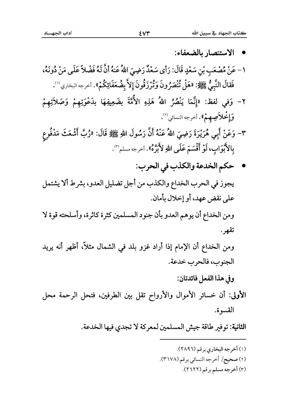 1 - عَنْ مُصْعَبِ بْنِ سَعْدٍ قَالَ: رَأى سَعْدٌ رَضِيَ اللهُ عَنهُ أنَّ لَهُ فَضْلاً عَلَى مَنْ دُونَهُ، فَقالَ النَّبِيُّ - صلى الله عليه وسلم -: «هَلْ تُنْصَرُونَ وَتُرْزَقُونَ إِلاَّ بِضُعَفَائِكُمْ». أخرجه البخاري (¬1).