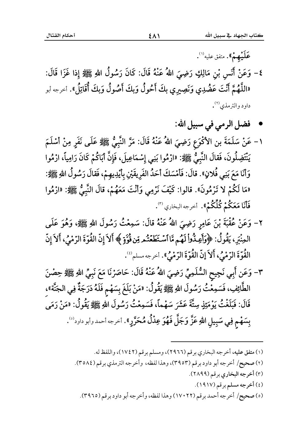 3 - وَعَن أَبِي نَجِيحٍ السُّلَمِيِّ رَضِيَ اللهُ عَنْهُ قَالَ: حَاصَرْنَا مَعَ نَبِيِّ اللهِ - صلى الله عليه وسلم - حِصْنَ الطَّائِفِ، فَسَمِعْتُ رَسُولَ اللهِ - صلى الله عليه وسلم - يَقُولُ: «مَنْ بَلَغَ بِسَهْمٍ فَلَهُ دَرَجَةٌ فِي الجَنَّة»،ِ قَالَ: فَبَلَغْتُ يَوْمَئِذٍ سِتَّةَ عَشَرَ سَهْماً، فَسَمِعْتُ رَسُولَ اللهِ - صلى الله عليه وسلم - يَقُولُ: «مَنْ رَمَى بِسَهْمٍ فِي سَبِيلِ اللهِ عَزَّ وَجَلَّ فَهُوَ عِدْلُ مُحَرَّرٍ». أخرجه أحمد وأبو داود (¬5).
