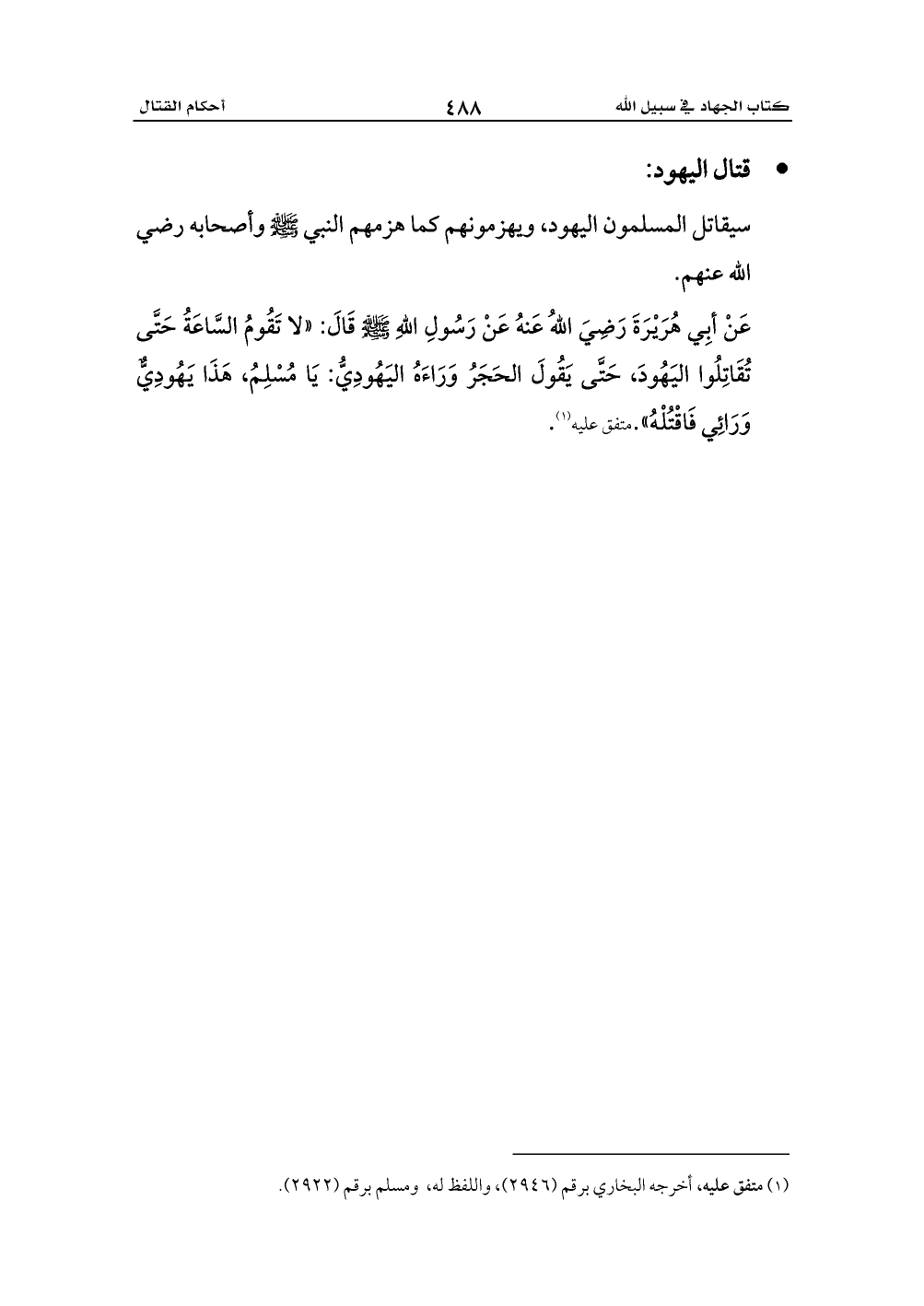 عَنْ أبِي هُرَيْرَةَ رَضِيَ اللهُ عَنهُ عَنْ رَسُولِ اللهِ - صلى الله عليه وسلم - قَالَ: «لا تَقُومُ السَّاعَةُ حَتَّى تُقَاتِلُوا اليَهُودَ، حَتَّى يَقُولَ الحَجَرُ وَرَاءَهُ اليَهُودِيُّ: يَا مُسْلِمُ، هَذَا يَهُودِيٌّ وَرَائِي فَاقْتُلْهُ».متفق عليه (¬1).