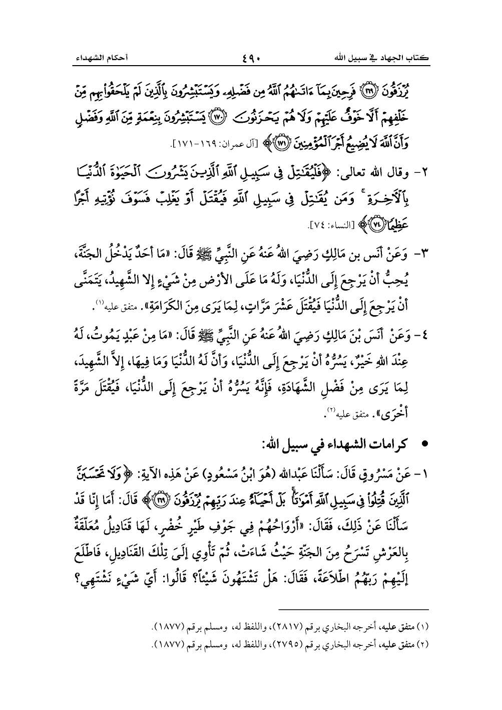 1 - عَنْ مَسْرُوقٍ قَالَ: سَأَلْنَا عَبْدالله (هُوَ ابْنُ مَسْعُودٍ) عَنْ هَذِه الآيةِ: {وَلَا تَحْسَبَنَّ الَّذِينَ قُتِلُوا فِي سَبِيلِ اللَّهِ أَمْوَاتًا بَلْ أَحْيَاءٌ عِنْدَ رَبِّهِمْ يُرْزَقُونَ (169)} قَالَ: أَمَا إِنّا قَدْ سَأَلْنَا عَنْ ذَلِكَ، فَقَالَ: «أَرْوَاحُهُمْ فِي جَوْفِ طَيْرٍ خُضْرٍ، لَهَا قَنَادِيلُ مُعَلّقَةٌ بِالعَرْشِ تَسْرَحُ مِنَ الجَنّةِ حَيْثُ شَاءَتْ، ثُمّ تَأْوِي إلَىَ تِلْكَ القَنَادِيلِ، فَاطّلَعَ إلَيْهِمْ رَبّهُمُ اطّلاَعَةً، فَقَالَ: هَلْ تَشْتَهُونَ شَيْئاً؟ قَالُوا: أَيّ شَيْءٍ نَشْتَهِي؟