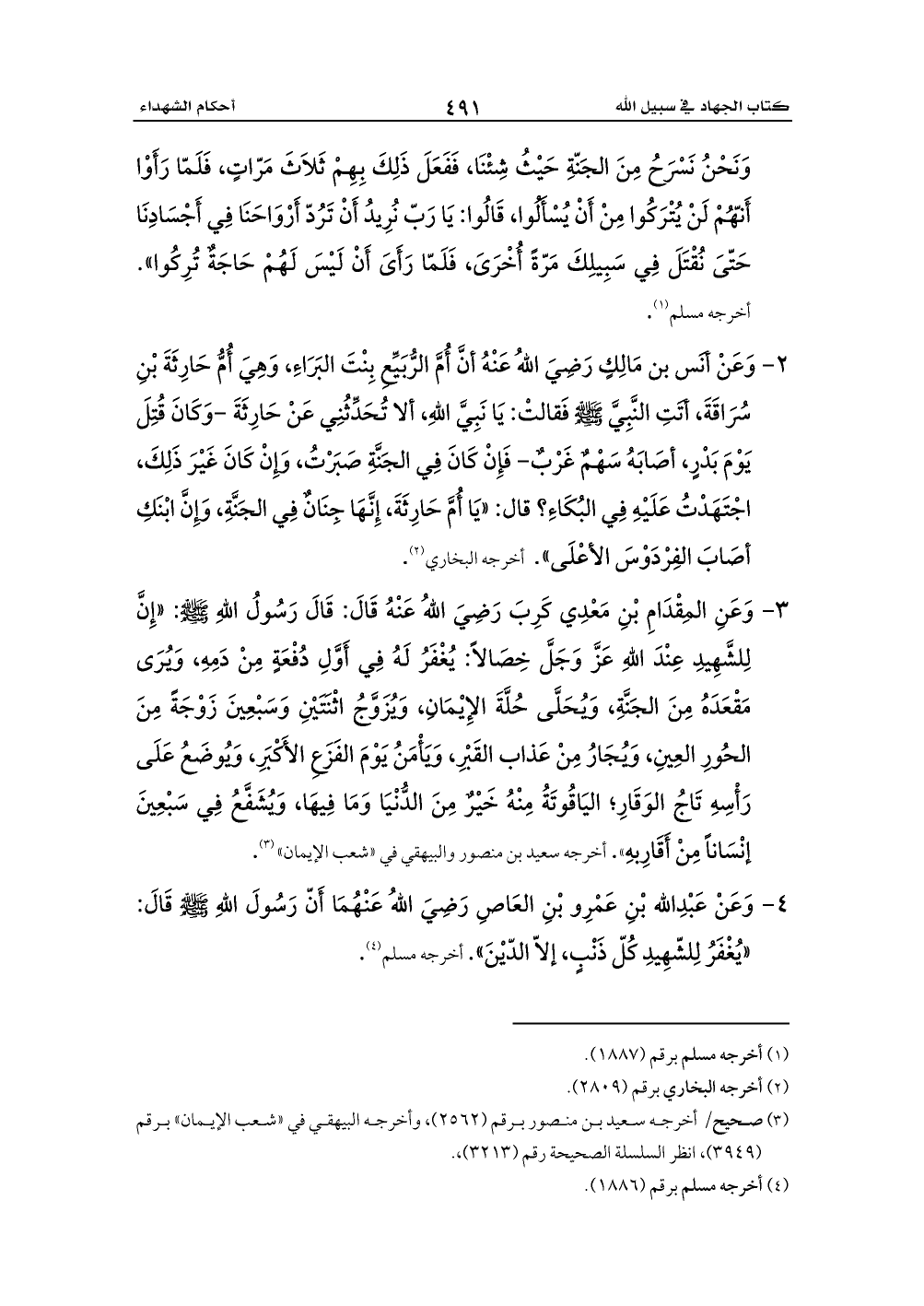 وَنَحْنُ نَسْرَحُ مِنَ الجَنّةِ حَيْثُ شِئْنَا، فَفَعَلَ ذَلِكَ بِهِمْ ثَلاَثَ مَرّاتٍ، فَلَمّا رَأَوْا أَنّهُمْ لَنْ يُتْرَكُوا مِنْ أَنْ يُسْأَلُوا، قَالُوا: يَا رَبّ نُرِيدُ أَنْ تَرُدّ أَرْوَاحَنَا فِي أَجْسَادِنَا حَتّىَ نُقْتَلَ فِي سَبِيلِكَ مَرّةً أُخْرَىَ، فَلَمّا رَأَىَ أَنْ لَيْسَ لَهُمْ حَاجَةٌ تُرِكُوا». أخرجه مسلم (¬1).