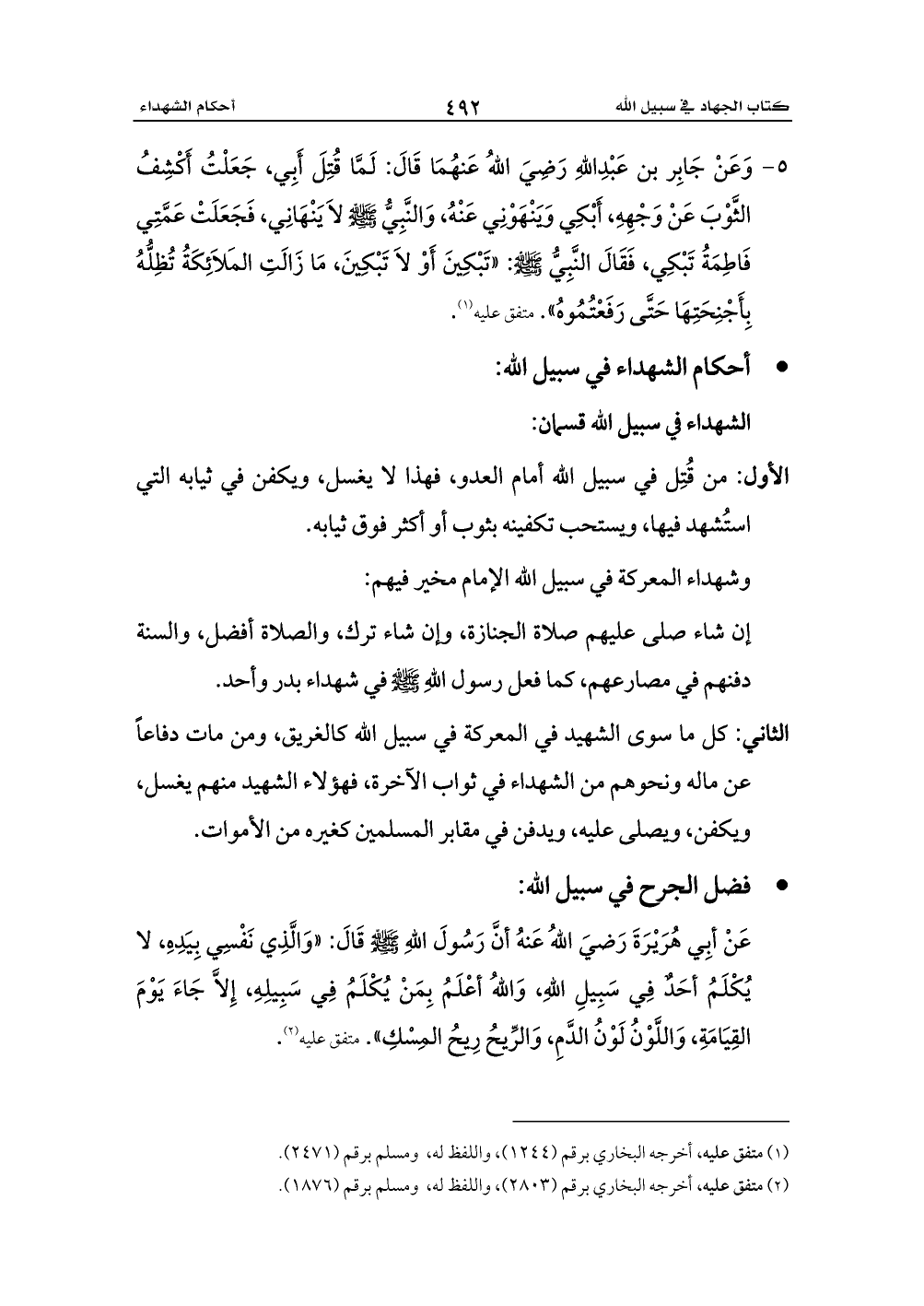 5 - وَعَنْ جَابِر بن عَبْدِاللهِ رَضِيَ اللهُ عَنهُمَا قَالَ: لَمَّا قُتِلَ أَبِي، جَعَلْتُ أَكْشِفُ الثَّوْبَ عَنْ وَجْهِهِ، أَبْكِي وَيَنْهَوْنِي عَنْهُ، وَالنَّبِيُّ - صلى الله عليه وسلم - لاَ يَنْهَانِي، فَجَعَلَتْ عَمَّتِي فَاطِمَةُ تَبْكِي، فَقَالَ النَّبِيُّ - صلى الله عليه وسلم -: «تَبْكِينَ أَوْ لاَ تَبْكِينَ، مَا زَالَتِ المَلاَئِكَةُ تُظِلُّهُ بِأَجْنِحَتِهَا حَتَّى رَفَعْتُمُوهُ». متفق عليه (¬1).