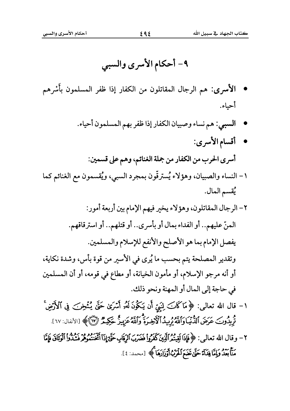 - الأسرى: هم الرجال المقاتلون من الكفار إذا ظفر المسلمون بأَسْرهم أحياء.