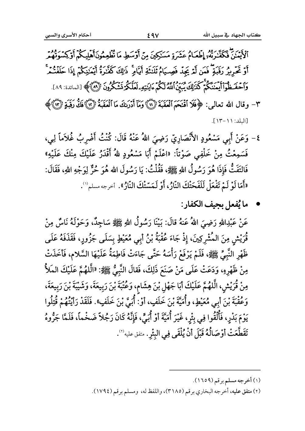 عَنْ عَبْدِاللهِ رَضِيَ اللهُ عَنهُ قالَ: بَيْنَا رَسُولُ اللهِ - صلى الله عليه وسلم - سَاجِدٌ، وَحَوْلَهُ نَاسٌ مِنْ قُرَيْشٍ مِنَ المُشْرِكِينَ، إِذْ جَاءَ عُقْبَةُ بْنُ أبِي مُعَيْطٍ بِسَلَى جَزُورٍ، فَقَذَفَهُ عَلَى ظَهْرِ النَّبِيِّ - صلى الله عليه وسلم -، فَلَمْ يَرْفَعْ رَأْسَهُ حَتَّى جَاءَتْ فَاطِمَةُ عَلَيْهَا السَّلام، فَأخَذَتْ مِنْ ظَهْرِهِ، وَدَعَتْ عَلَى مَنْ صَنَعَ ذَلِكَ، فَقالَ النَّبِيُّ - صلى الله عليه وسلم -: «الَّلهُمَّ عَلَيْكَ المَلأُ مِنْ قُرَيْشٍ، الَّلهُمَّ عَلَيْكَ أبَا جَهْلِ بْنَ هِشَامٍ، وَعُتْبَةَ بْنَ رَبِيعَةَ، وَشَيْبَةَ بْنَ رَبِيعَةَ، وَعُقْبَةَ بْنَ أبِي مُعَيْطٍ، وأُمَيَّةَ بْنَ خَلَفٍ، أوْ: أُبَيَّ بْنَ خَلَفٍ». فَلَقَدْ رَأيْتُهُمْ قُتِلُوا يَوْمَ بَدْرٍ، فَأُلْقُوا فِي بِئْرٍ، غَيْرَ أُمَيَّةَ أوْ أُبَيٍّ، فَإِنَّهُ كَانَ رَجُلاً ضَخْماً، فَلَمَّا جَرُّوهُ تَقَطَّعَتْ أوْصَالُهُ قَبْلَ أنْ يُلْقَى فِي البِئْرِ. متفق عليه (¬2).