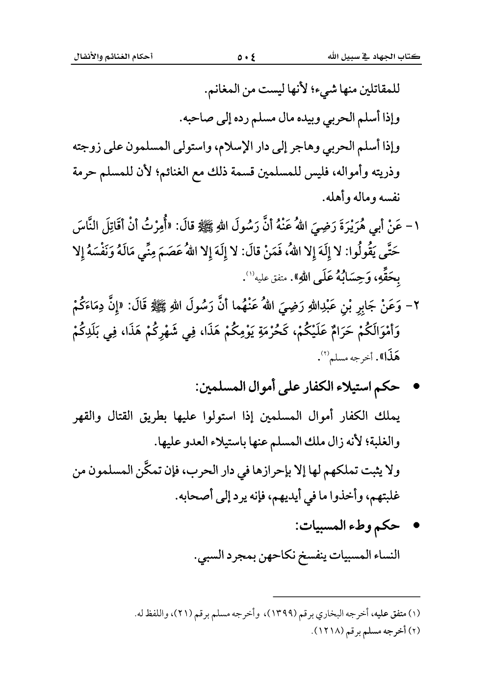 وإذا أسلم الحربي وهاجر إلى دار الإسلام، واستولى المسلمون على زوجته وذريته وأمواله، فليس للمسلمين قسمة ذلك مع الغنائم؛ لأن للمسلم حرمة نفسه وماله وأهله.