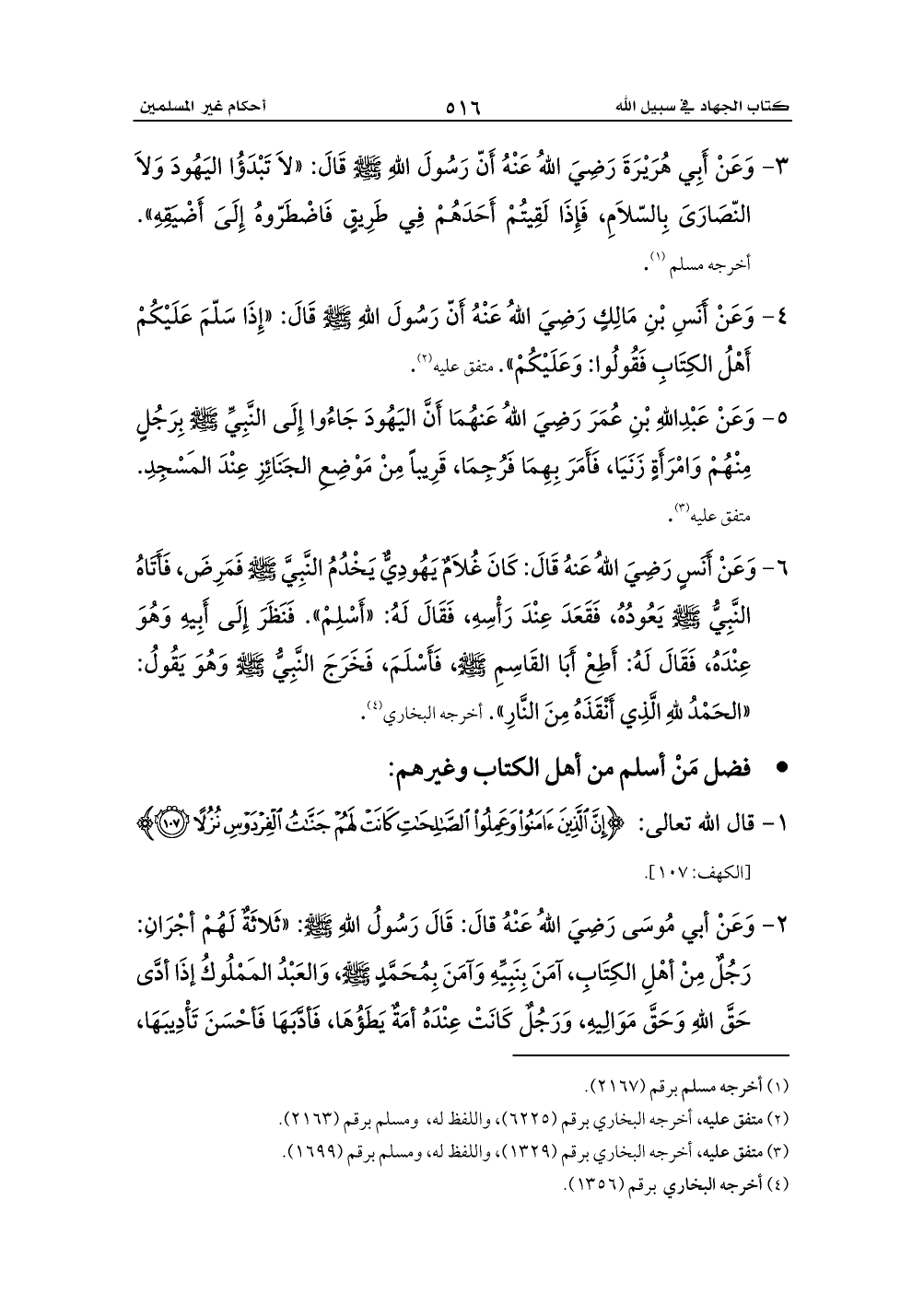 3 - وَعَنْ أَبِي هُرَيْرَةَ رَضِيَ اللهُ عَنْهُ أَنّ رَسُولَ اللهِ - صلى الله عليه وسلم - قَالَ: «لاَ تَبْدَؤُا اليَهُودَ وَلاَ النّصَارَىَ بِالسّلاَمِ، فَإِذَا لَقِيتُمْ أَحَدَهُمْ فِي طَرِيقٍ فَاضْطَرّوهُ إِلَىَ أَضْيَقِهِ». أخرجه مسلم (¬1).