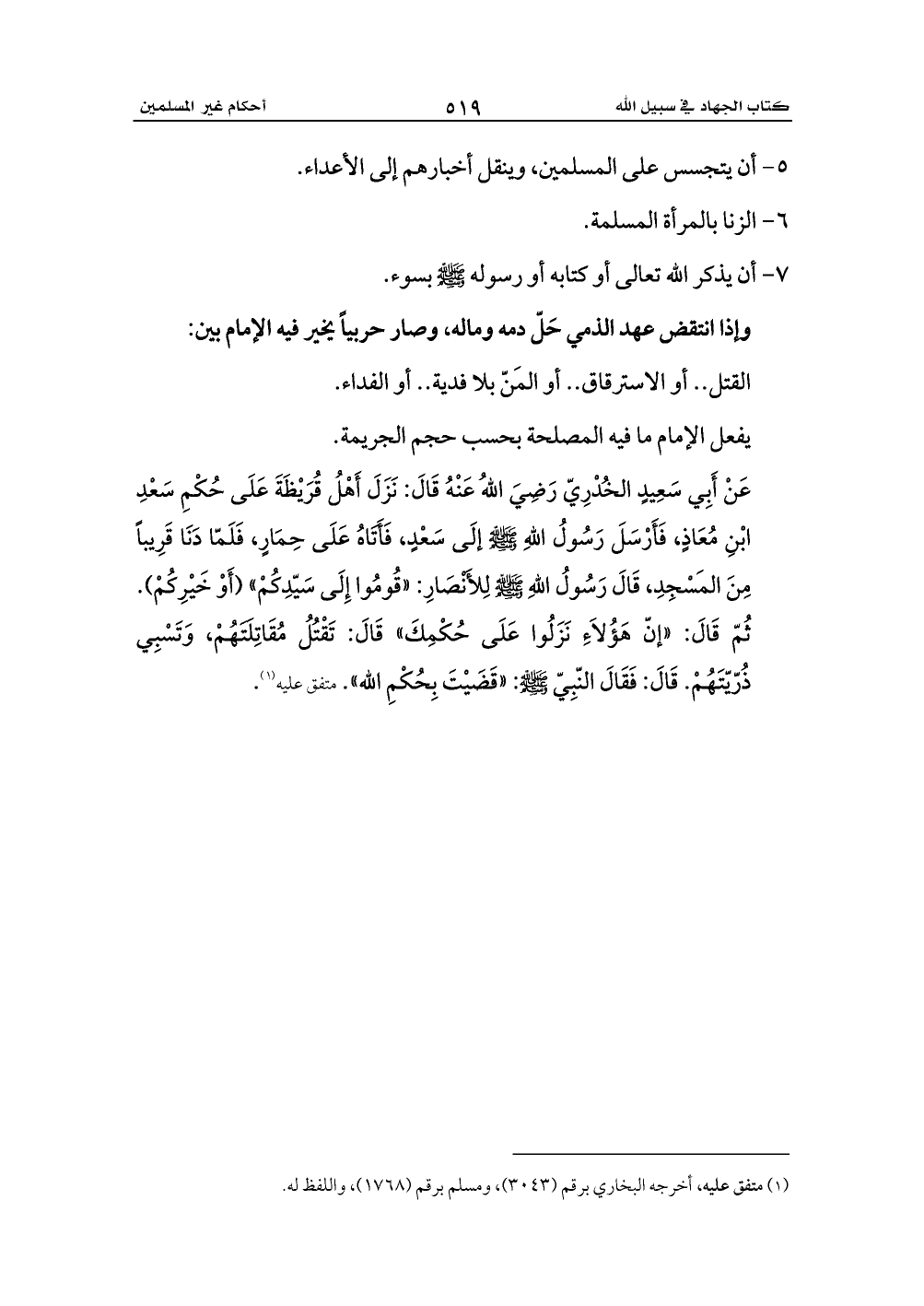 عَنْ أَبِي سَعِيدٍ الخُدْرِيّ رَضِيَ اللهُ عَنْهُ قَالَ: نَزَلَ أَهْلُ قُرَيْظَةَ عَلَى حُكْمِ سَعْدِ ابْنِ مُعَاذٍ، فَأَرْسَلَ رَسُولُ اللهِ - صلى الله عليه وسلم - إلَى سَعْدٍ، فَأَتَاهُ عَلَى حِمَارٍ، فَلَمّا دَنَا قَرِيباً مِنَ المَسْجِدِ، قَالَ رَسُولُ اللهِ - صلى الله عليه وسلم - لِلأَنْصَارِ: «قُومُوا إِلَى سَيّدِكُمْ» (أَوْ خَيْرِكُمْ). ثُمّ قَالَ: «إنّ هَؤُلاَءِ نَزَلُوا عَلَى حُكْمِكَ» قَالَ: تَقْتُلُ مُقَاتِلَتَهُمْ، وَتَسْبِي ذُرّيّتَهُمْ. قَالَ: فَقَالَ النّبِيّ - صلى الله عليه وسلم -: «قَضَيْتَ بِحُكْمِ الله». متفق عليه (¬1).