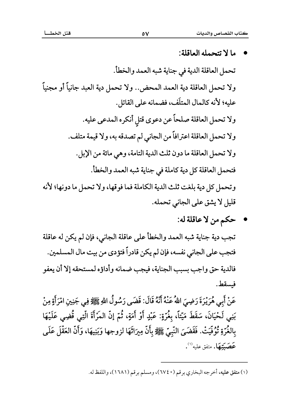 عَنْ أَبِي هُرَيْرَةَ رَضِيَ اللهُ عَنْهُ أَنّهُ قَالَ: قَضَى رَسُولُ اللهِ - صلى الله عليه وسلم - فِي جَنِينِ امْرَأَةٍ مِنْ بَنِي لَحْيَانَ، سَقَطَ مَيّتاً، بِغُرّةٍ: عَبْدٍ أَوْ أَمَةٍ، ثُمّ إنّ المَرْأَةَ الّتِي قُضِي عَلَيْهَا بِالغُرّةِ تُوُفّيَتْ. فَقَضَىَ النّبِيّ - صلى الله عليه وسلم - بِأَنّ مِيرَاثَهَا لزوجها وَبَنِيهَا، وَأَنّ العَقْلَ عَلَى عَصَبَتِهَا. متفق عليه (¬1).