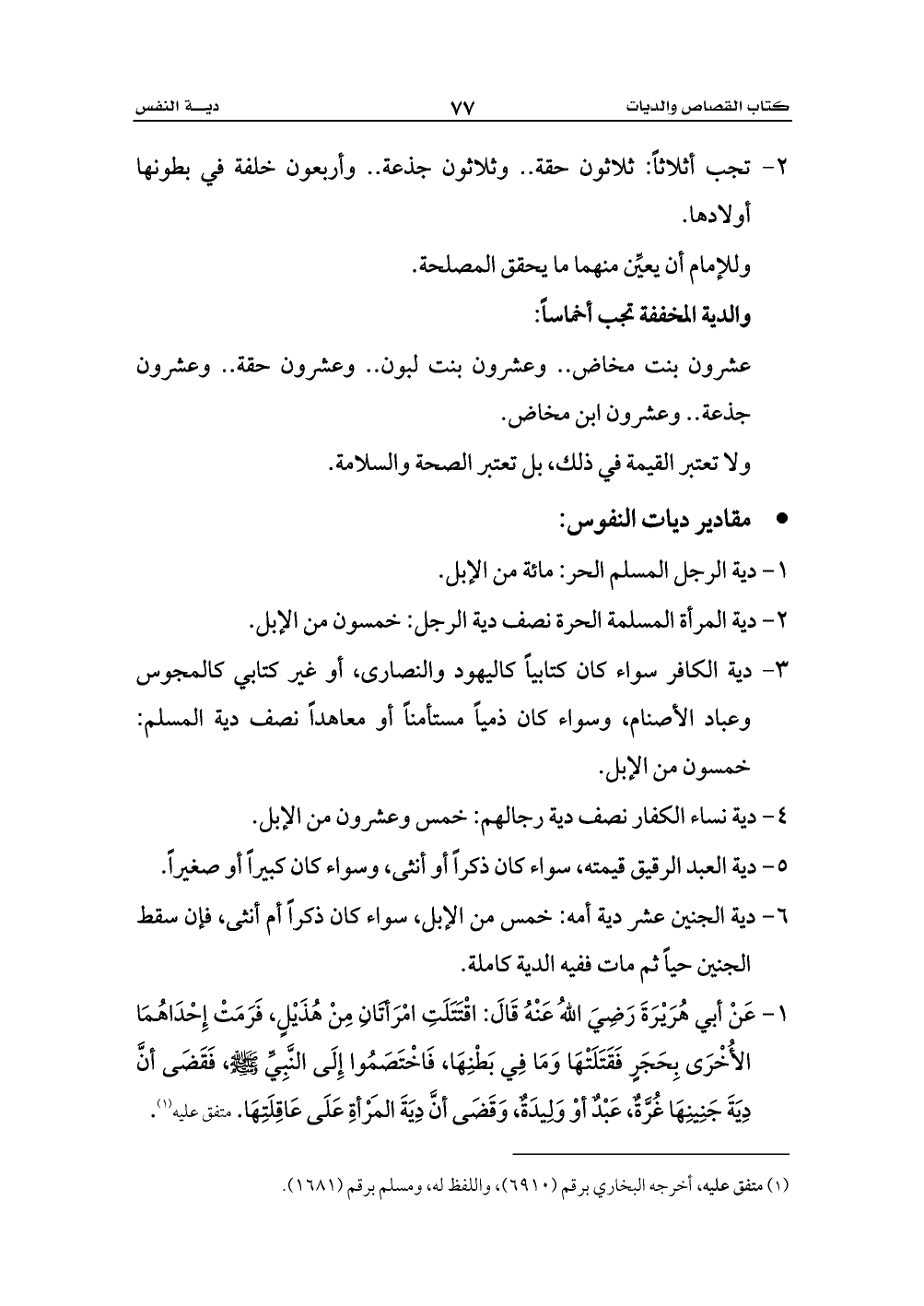 1 - عَنْ أبي هُرَيْرَةَ رَضِيَ اللهُ عَنْهُ قَالَ: اقْتَتَلَتِ امْرَأتَانِ مِنْ هُذَيْلٍ، فَرَمَتْ إِحْدَاهُمَا الأُخْرَى بِحَجَرٍ فَقَتَلَتْهَا وَمَا فِي بَطْنِهَا، فَاخْتَصَمُوا إِلَى النَّبِيِّ - صلى الله عليه وسلم -، فَقَضَى أنَّ