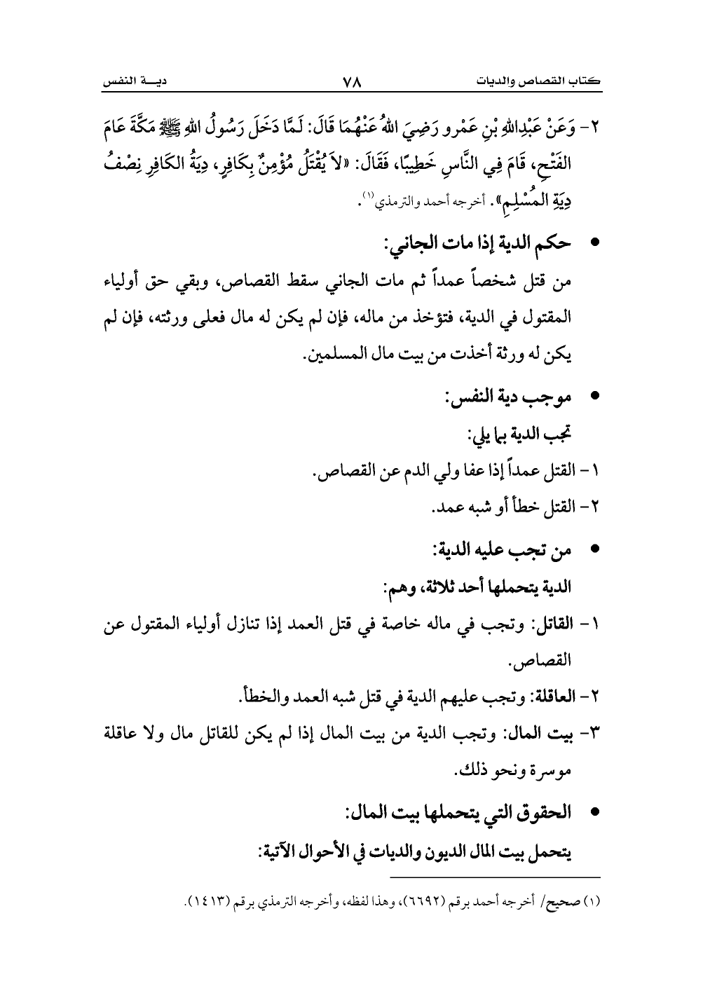 2 - وَعَنْ عَبْدِاللهِ بْنِ عَمْرو رَضِيَ اللهُ عَنْهُمَا قَالَ: لَمَّا دَخَلَ رَسُولُ اللهِ - صلى الله عليه وسلم - مَكَّةَ عَامَ الفَتْحِ، قَامَ فِي النَّاسِ خَطِيبًا، فَقَالَ: «لاَ يُقْتَلُ مُؤْمِنٌ بِكَافِرٍ، دِيَةُ الكَافِرِ نِصْفُ دِيَةِ المُسْلِمِ». أخرجه أحمد والترمذي (¬1).