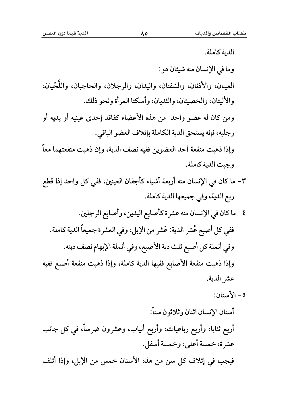 3 - ما كان في الإنسان منه أربعة أشياء كأجفان العينين، ففي كل واحد إذا قطع ربع الدية، وفي جميعها الدية كاملة.