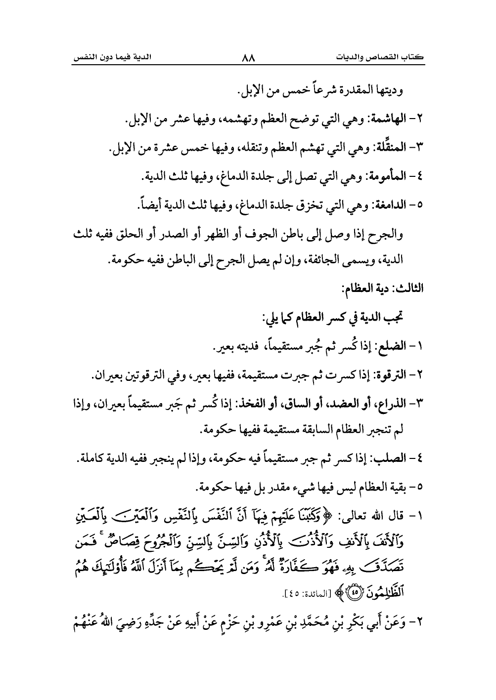 1 - قال الله تعالى: {وَكَتَبْنَا عَلَيْهِمْ فِيهَا أَنَّ النَّفْسَ بِالنَّفْسِ وَالْعَيْنَ بِالْعَيْنِ وَالْأَنْفَ بِالْأَنْفِ وَالْأُذُنَ بِالْأُذُنِ وَالسِّنَّ بِالسِّنِّ وَالْجُرُوحَ قِصَاصٌ فَمَنْ تَصَدَّقَ بِهِ فَهُوَ كَفَّارَةٌ لَهُ وَمَنْ لَمْ يَحْكُمْ بِمَا أَنْزَلَ اللَّهُ فَأُولَئِكَ هُمُ الظَّالِمُونَ (45)} [المائدة: 45].