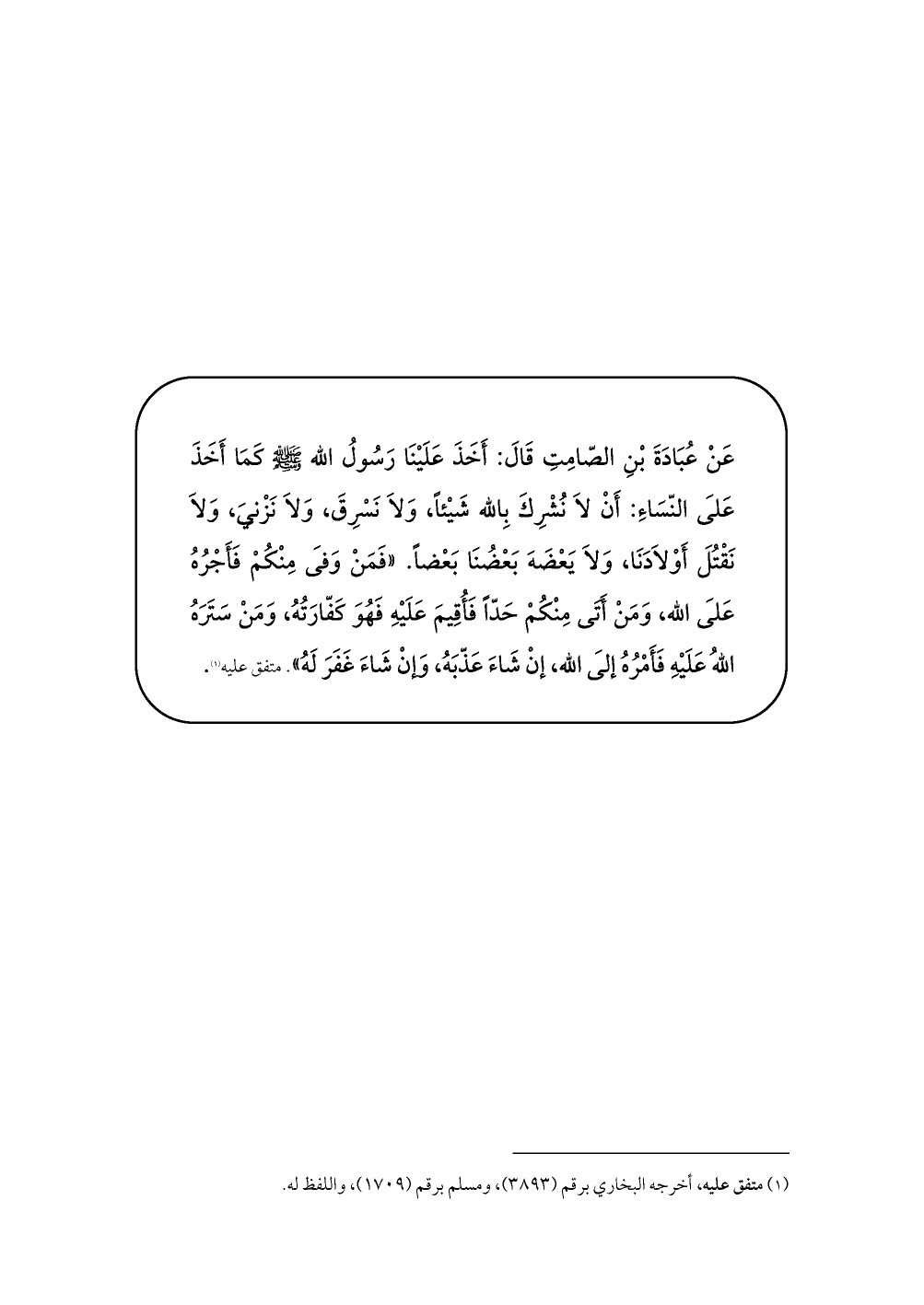 عَنْ عُبَادَةَ بْنِ الصّامِتِ قَالَ: أَخَذَ عَلَيْنَا رَسُولُ الله - صلى الله عليه وسلم - كَمَا أَخَذَ عَلَى النّسَاءِ: أَنْ لاَ نُشْرِكَ بِالله شَيْئاً، وَلاَ نَسْرِقَ، وَلاَ نَزْنِيَ، وَلاَ نَقْتُلَ أَوْلاَدَنَا، وَلاَ يَعْضَهَ بَعْضُنَا بَعْضاً. «فَمَنْ وَفَى مِنْكُمْ فَأَجْرُهُ عَلَى الله، وَمَنْ أَتَى مِنْكُمْ حَدّاً فَأُقِيمَ عَلَيْهِ فَهُوَ كَفّارَتُهُ، وَمَنْ سَتَرَهُ اللهُ عَلَيْهِ فَأَمْرُهُ إلَى الله، إنْ شَاءَ عَذّبَهُ، وَإنْ شَاءَ غَفَرَ لَهُ». متفق عليه (¬1).