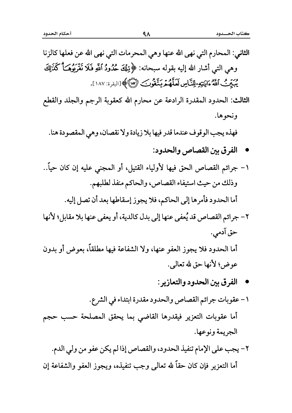 الثالث: الحدود المقدرة الرادعة عن محارم الله كعقوبة الرجم والجلد والقطع ونحوها.