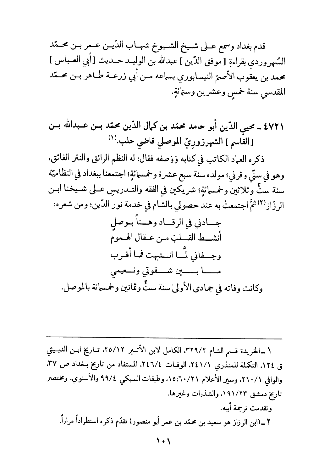 (¬1) الخريدة قسم الشام 329/ 2، الكامل لابن الأثير 25/ 12، تاريخ ابن الدبيثي ق 124، التكملة للمنذري 241/ 1، الوفيات 246/ 4، المستفاد من تاريخ بغداد ص 37، والوافي 210/ 1، وسير الأعلام 60/ 21: 15، وطبقات السبكي 99/ 4 والأسنوي، ومختصر تاريخ دمشق 191/ 23، والشذرات وغيرها. وتقدمت ترجمة أبيه.