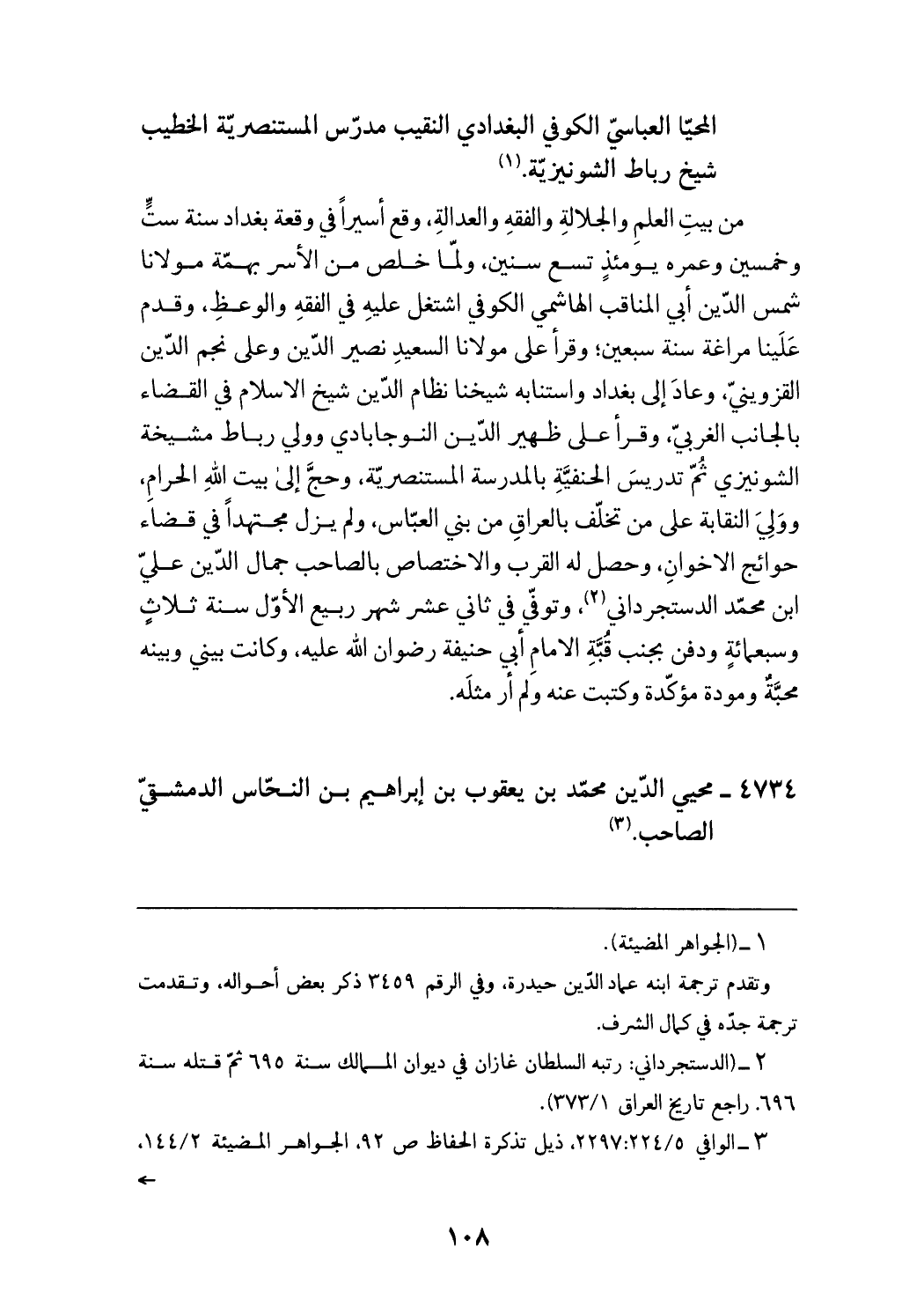 من بيت العلم والجلالة والفقه والعدالة، وقع أسيرا في وقعة بغداد سنة ستّ وخمسين وعمره يومئذ تسع سنين، ولمّا خلص من الأسر بهمّة مولانا شمس الدّين أبي المناقب الهاشمي الكوفي اشتغل عليه في الفقه والوعظ، وقدم علينا مراغة سنة سبعين؛ وقرأ على مولانا السعيد نصير الدّين وعلى نجم الدّين القزوينيّ، وعاد إلى بغداد واستنابه شيخنا نظام الدّين شيخ الاسلام في القضاء بالجانب الغربيّ، وقرأ على ظهير الدّين النوجابادي وولي رباط مشيخة الشونيزي ثمّ تدريس الحنفيّة بالمدرسة المستنصريّة، وحجّ إلى بيت الله الحرام، وولي النقابة على من تخلّف بالعراق من بني العبّاس، ولم يزل مجتهدا في قضاء حوائج الاخوان، وحصل له القرب والاختصاص بالصاحب جمال الدّين عليّ ابن محمّد الدستجرداني (¬2)، وتوفّي في ثاني عشر شهر ربيع الأوّل سنة ثلاث وسبعمائة ودفن بجنب قبّة الامام أبي حنيفة رضوان الله عليه، وكانت بيني وبينه محبّة ومودة مؤكّدة وكتبت عنه ولم أر مثله.
