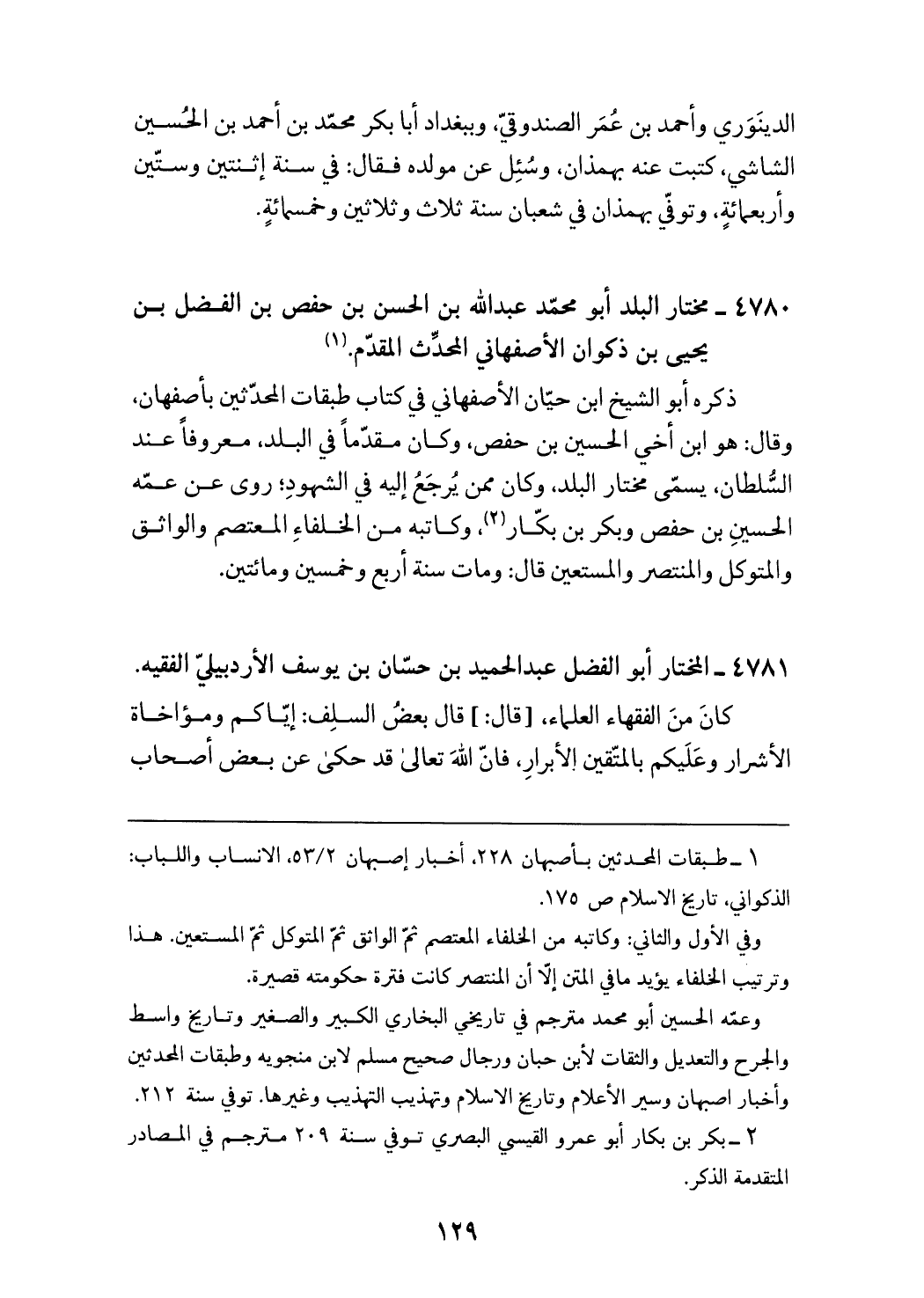 (¬1) طبقات المحدثين بأصبهان 228، أخبار أصبهان 53/ 2، الانساب واللباب: الذكواني، تاريخ الاسلام ص 175. وفي الأول والثاني: وكاتبه من الخلفاء المعتصم ثمّ الواثق ثمّ المتوكل ثمّ المستعين. هذا وترتيب الخلفاء يؤيد ما في المتن إلاّ أن المنتصر كانت فترة حكومته قصيرة. وعمّه الحسين أبو محمد مترجم في تاريخي البخاري الكبير والصغير وتاريخ واسط والجرح والتعديل والثقات لابن حبان ورجال صحيح مسلم لابن منجويه وطبقات المحدثين وأخبار اصبهان وسير الأعلام وتاريخ الاسلام وتهذيب التهذيب وغيرها. توفي سنة 212.