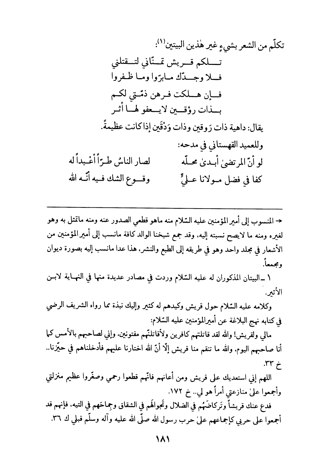 (¬1) البيتان المذكوران له عليه السّلام وردت في مصادر عديدة منها في النهاية لابن الأثير. وكلامه عليه السّلام حول قريش وكيدهم له كثير وإليك نبذة مما رواه الشريف الرضي في كتابه نهج البلاغة عن أمير المؤمنين عليه السّلام: مالي ولقريش! والله لقد قاتلتهم كافرين ولأقاتلنّهم مفتونين، وإني لصاحبهم بالأمس كما أنا صاحبهم اليوم، والله ما تنقم منا قريش إلاّ أنّ الله اختارنا عليهم فأدخلناهم في حيّزنا .. خ 33. اللهم إني استعديك على قريش ومن أعانهم فانّهم قطعوا رحمي وصغّروا عظيم منزلتي وأجمعوا على منازعتي أمرا هو لي .. خ 172. فدع عنك قريشا وتركاضهم في الضلال وتجوالهم في الشقاق وجماحهم في التيه، فإنهم قد أجمعوا على حربي كإجماعهم على حرب رسول الله صلّى الله عليه وآله وسلّم قبلي ك 36.