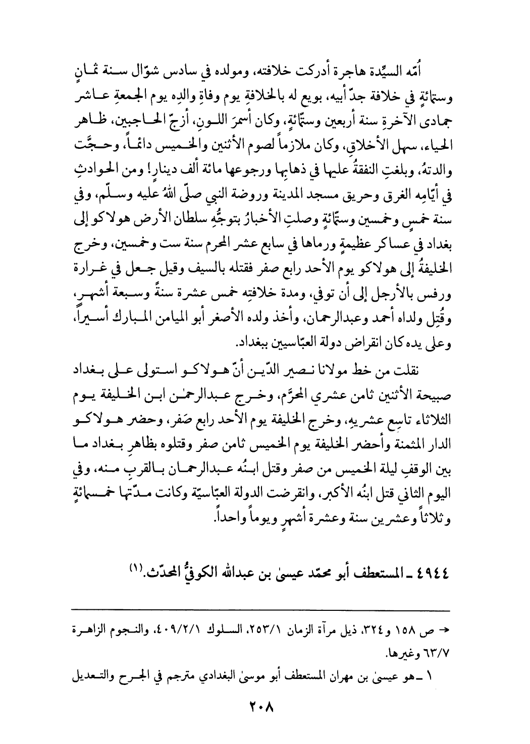 نقلت من خط مولانا نصير الدّين أنّ هولاكو استولى على بغداد صبيحة الاثنين ثامن عشري المحرّم، وخرج عبد الرحمن ابن الخليفة يوم الثلاثاء تاسع عشرية، وخرج الخليفة يوم الأحد رابع صفر، وحضر هولاكو الدار المثمنة وأحضر الخليفة يوم الخميس ثامن صفر وقتلوه بظاهر بغداد ما بين الوقف ليلة الخميس من صفر وقتل ابنه عبد الرحمن بالقرب منه، وفي اليوم الثاني قتل ابنه الأكبر، وانقرضت الدولة العبّاسيّة وكانت مدّتها خمسمائة وثلاثا وعشرين سنة وعشرة أشهر ويوما واحدا.