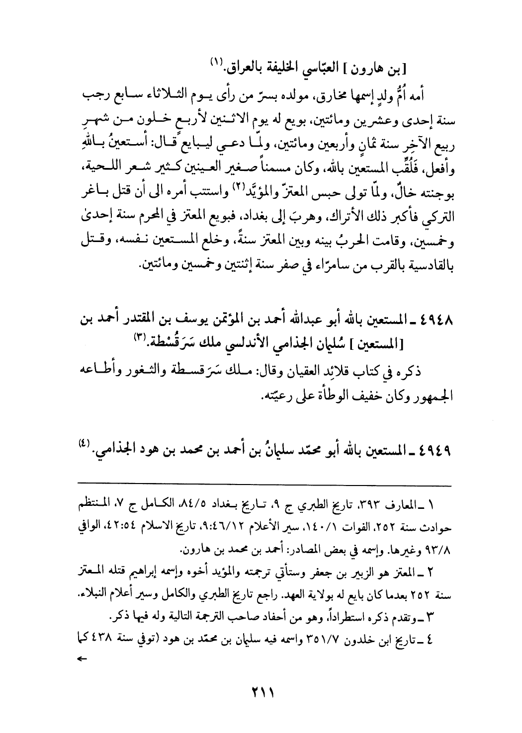 (¬2) المعتز هو الزبير بن جعفر وستأتي ترجمته والمؤيد أخوه واسمه إبراهيم قتله المعتز سنة 252 بعد ما كان بايع له بولاية العهد. راجع تاريخ الطبري والكامل وسير أعلام النبلاء.