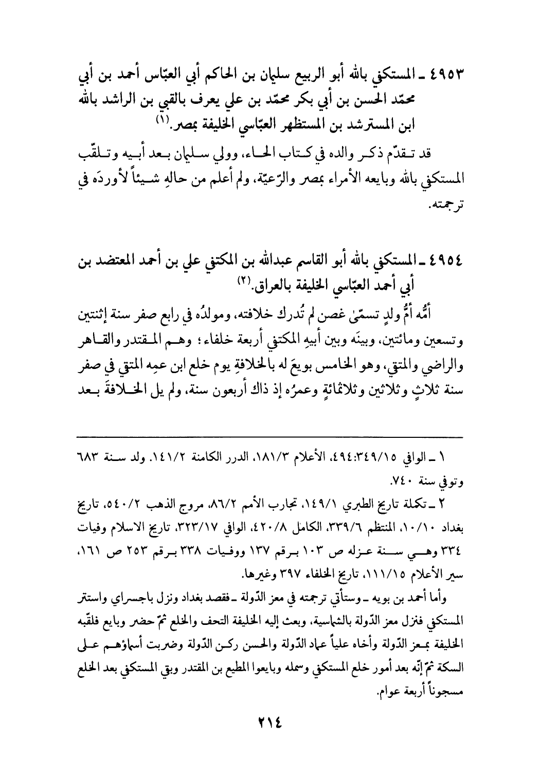 (¬2) تكملة تاريخ الطبري 149/ 1، تجارب الأمم 86/ 2، مروج الذهب 540/ 2، تاريخ بغداد 10/ 10، المنتظم 339/ 6، الكامل 420/ 8، الوافي 323/ 17، تاريخ الاسلام وفيات 334 وهي سنة عزله ص 103 برقم 137 ووفيات 338 برقم 253 ص 161، سير الأعلام 111/ 15، تاريخ الخلفاء 397 وغيرها. وأما أحمد بن بويه - وستأتي ترجمته في معز الدّولة - فقصد بغداد ونزل باجسراي واستتر المستكفي فنزل معز الدّولة بالشماسية، وبعث إليه الخليفة التحف والخلع ثمّ حضر وبايع فلقّبه الخليفة بمعزّ الدّولة وأخاه عليا عماد الدّولة والحسن ركن الدّولة وضربت أسماؤهم على السكة ثمّ إنّه بعد أمور خلع المستكفي وسمله وبايعوا المطيع بن المقتدر وبقي المستكفي بعد الخلع مسجونا أربعة عوام.