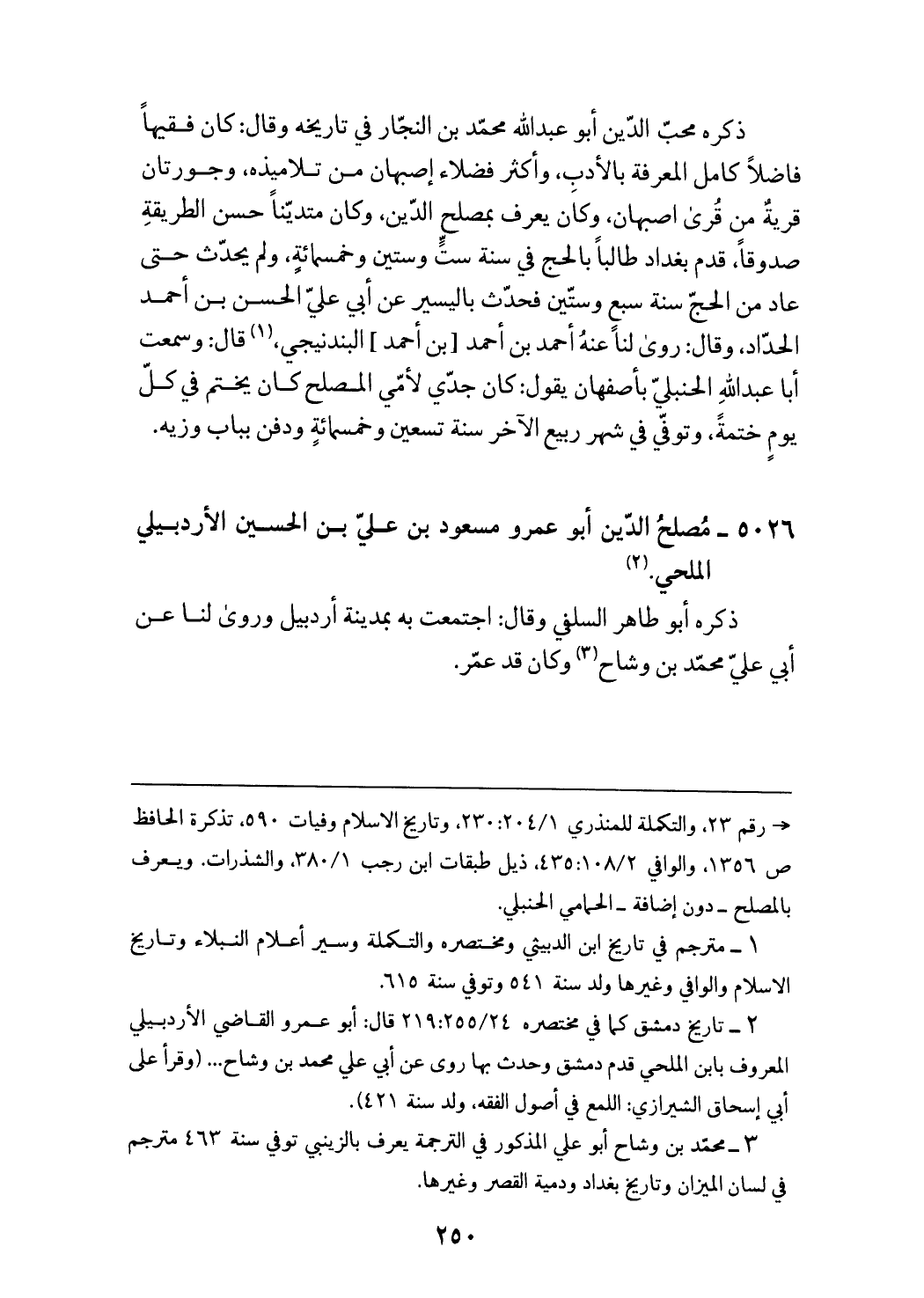 = رقم 23، والتكملة للمنذري 204/ 1: 230، وتاريخ الاسلام وفيات 590، تذكرة الحافظ ص 1356، والوافي 108/ 2: 435، ذيل طبقات ابن رجب 380/ 1، والشذرات. ويعرف بالمصلح - دون إضافة - الحمامي الحنبلي.