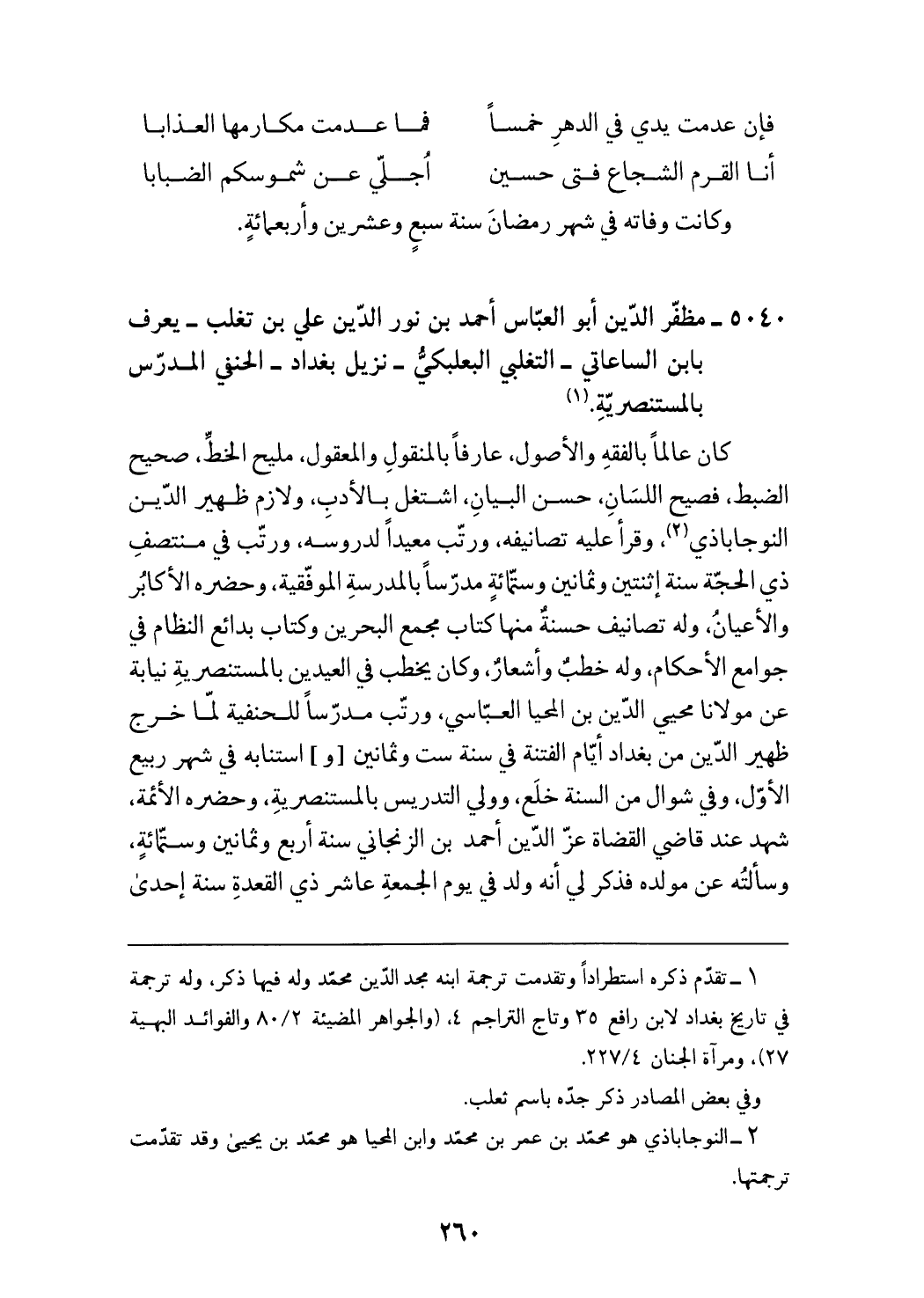 بابن الساعاتي - التغلبي البعلبكيّ - نزيل بغداد - الحنفي المدرّس