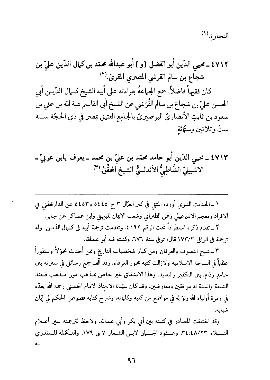 (¬3) شيخ التصوف والعرفان ومن كبار شخصيات التاريخ وممن أحدث تحوّلا وتطورا عظيما في الساحة الاسلامية ولا زالت كتبه محور العرفاء، وقد ألّف جمع رسائل في سيرته بين حامد وذام، بين التكفير والتعبيد، وهذا الانشقاق غير خاص بمذهب دون مذهب فعند الشيعة والسنة له موافقين ومعارضين، وقد كان سيّدنا الاستاذ الامام الخميني رحمه الله يعدّه في زمرة أولياء الله ونوّ به في مواضع من كتبه وكلماته، وشرح كتابه فصوص الحكم في إبّان شبابه. وقد اختلفت المصادر في كنيته بين أبي بكر وأبي عبد الله. ولاحظ لترجمته سير أعلام النبلاء 48/ 23: 34، وعقود الجمان لابن الشعار 7 ق 179، والتكملة للمنذري