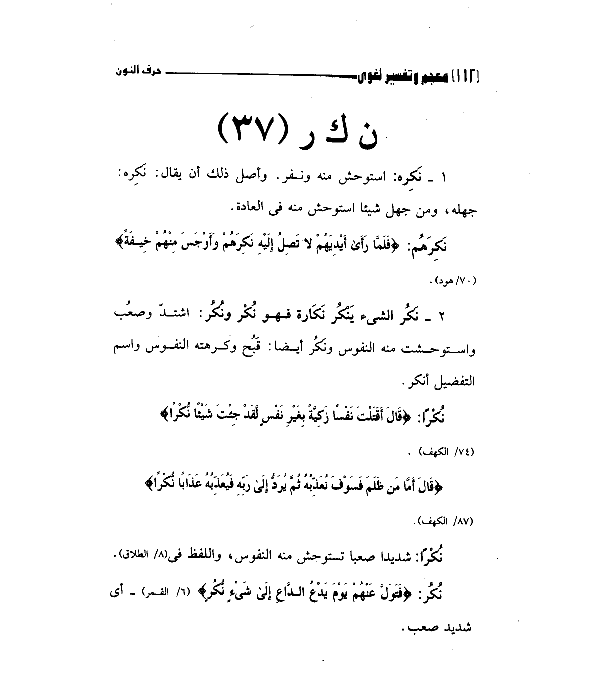 نكر: (فَتَوَلَّ عَنْهُمْ يَوْمَ يَدْعُ الدَّاعِي إِلَى شَيْءٍ نُكُرٍ) "6/القمر" أي شديد صعب.
