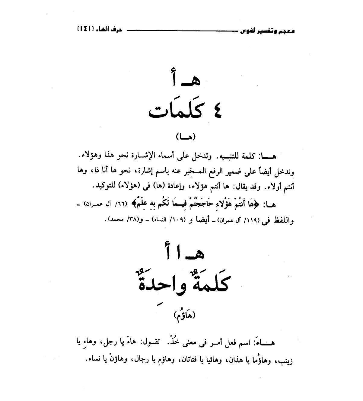 ها: كلمة للتنبيه. وتدخل علي أسماء الإشارة نحو هذا وهؤلاء وتدخل أيضا علي ضمير الرفع المخبر عنه باسم إشارة، نحو ها أنا ذا، وها أنتم أولاء وقد يقال: ها أنتم هؤلاء، وإعادة (ها) في (هؤلاء) للتوكيد.