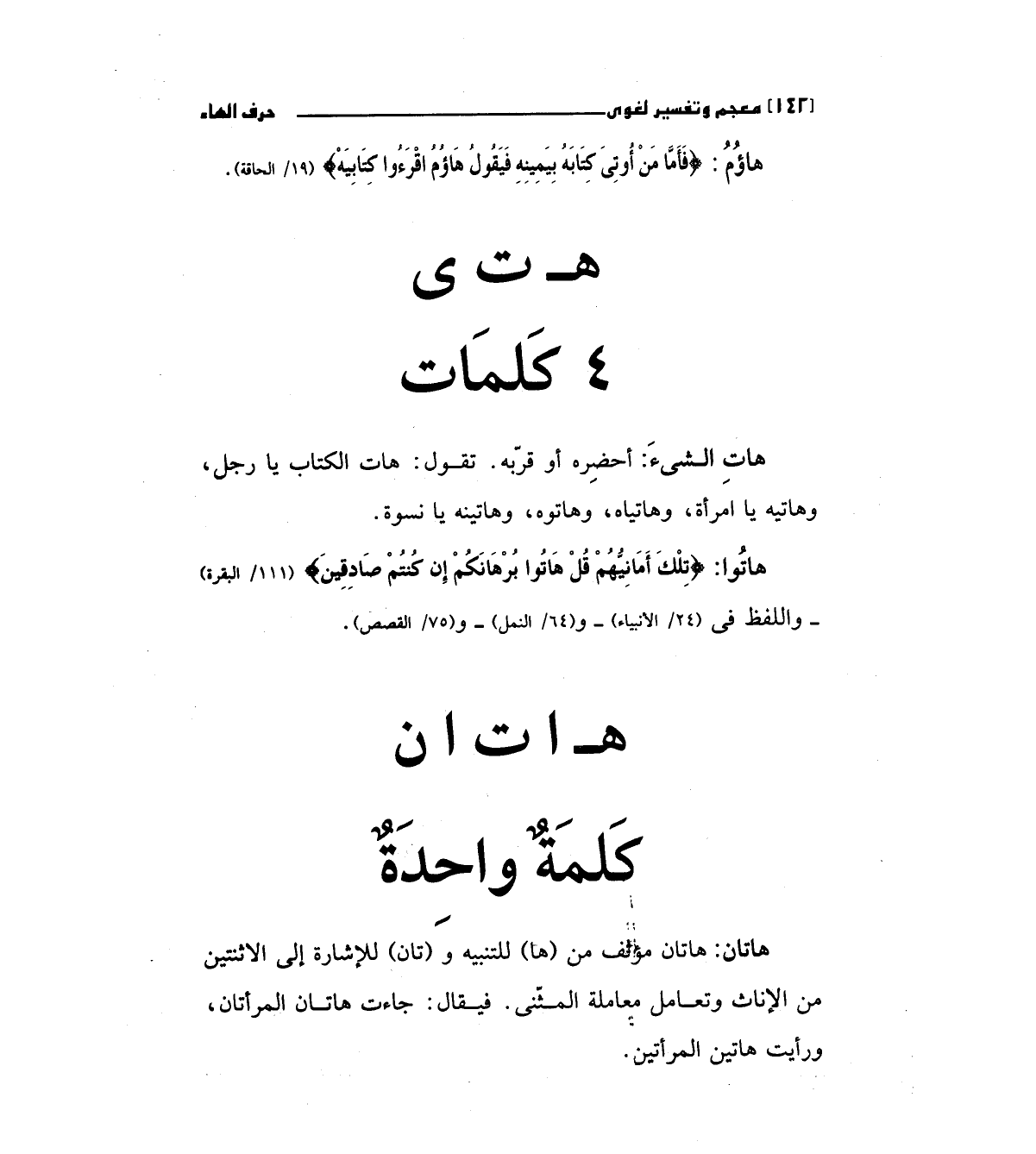 هات الشئ: أحضره أو قربه تقول: هات الكتاب يارجل وهاتيه يا مرآة، وهاتياه، وهاتوه، وهاتينه يا نسوة.