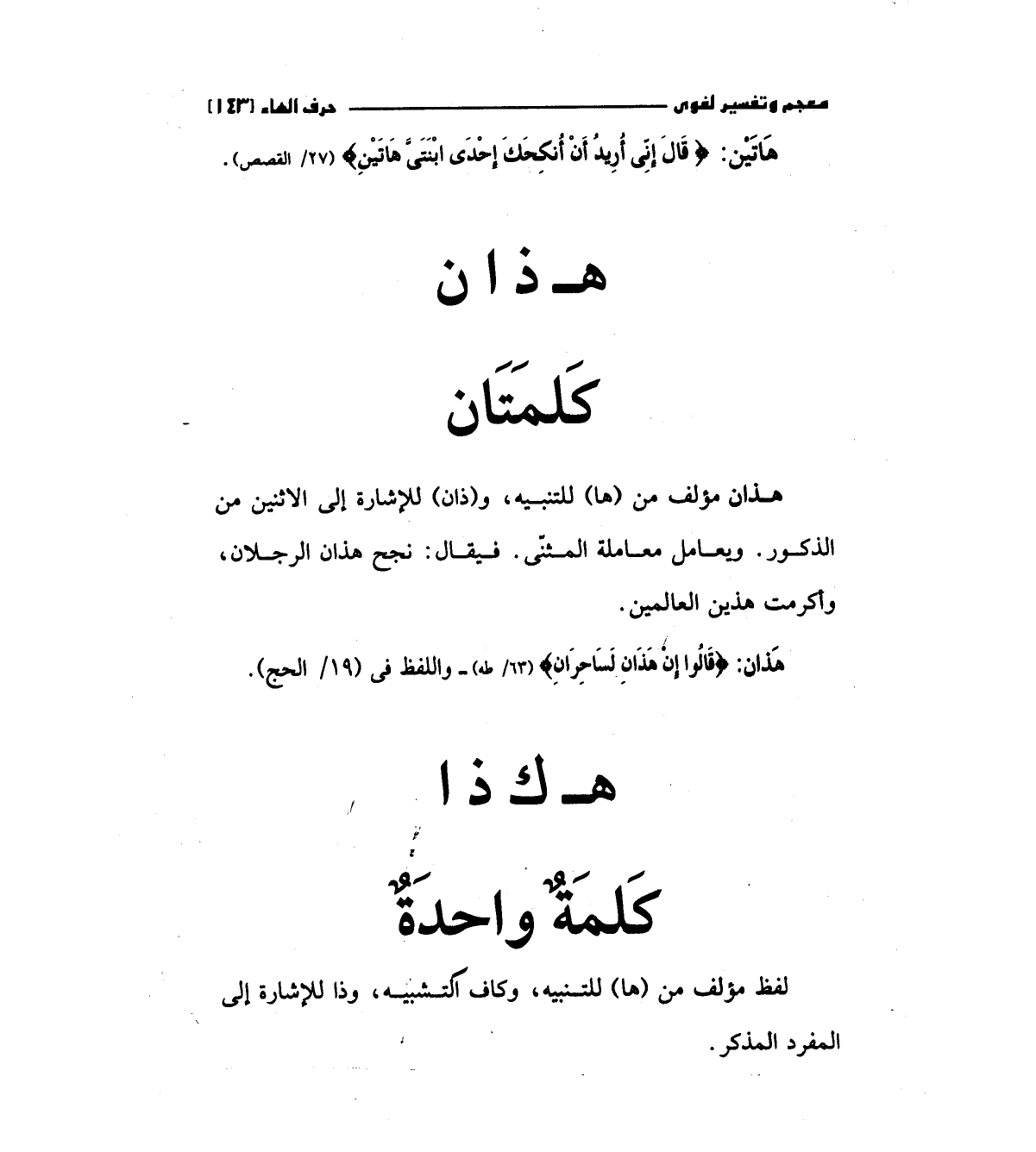 هذان مؤلف من (ها) للتنبيه، و (ذان) للإشارة إلي الاثنين من الذكور. ويعامل معاملة المثني فيقال: نجح هذان الرجلان، وأكرمت هذين العالمين.