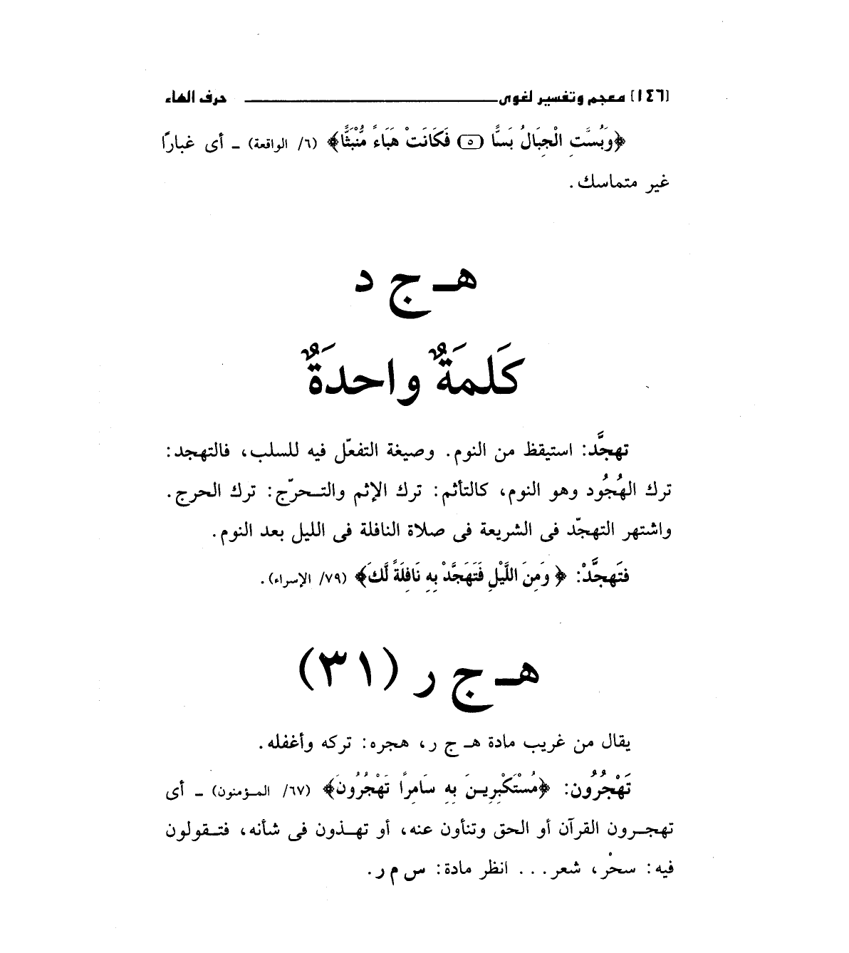تهجرون: (مُسْتَكْبِرِينَ بِهِ سَامِراً تَهْجُرُونَ) " 67/المؤمنون " أي تهجرون القرآن أو الحق وت، لون عنه، أو تهذون في شأنه، فتقولون فيه: سحر، شعر ... انظر: س م ر.