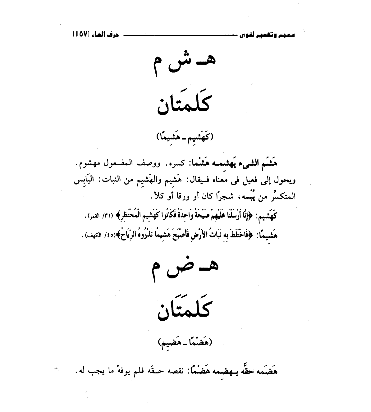 هشيما: (فَاخْتَلَطَ بِهِ نَبَاتُ الأَرْضِ فَأَصْبَحَ هَشِيماً تَذْرُوهُ الرِّيَاحُ) " 45/الكهف".