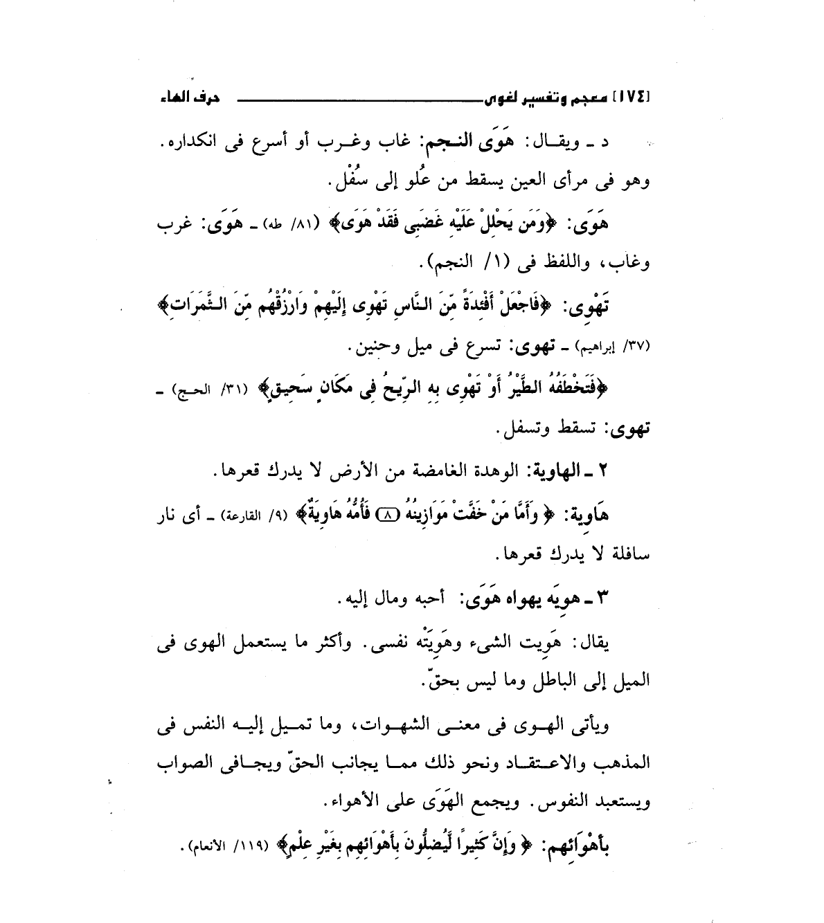 هوي: (وَمَنْ يَحْلِلْ عَلَيْهِ غَضَبِي فَقَدْ هَوَى) " 81/طه " هوي: غرب وغاب، واللفظ في (1/النجم).