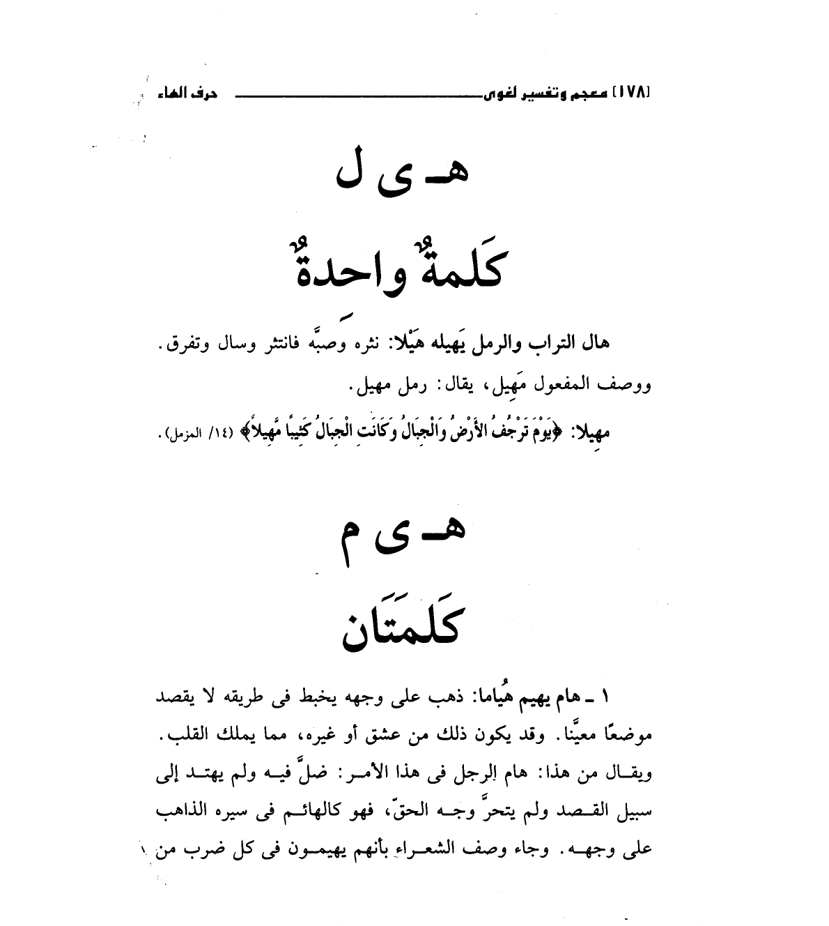 1 - هام يهيم هياما: ذهب علي وجهه يخبط في طريقه لا يقصد موضعا معينا وقد يكون ذلك من عشق أو غيره، مما يملك القلب ويقال من هذا: هام الرجل في هذا الأمر: ضل فيه ولم يهتد إلي سبيل القصد ولم يتحر وجه الحق، فهو كالهائم في سيره الذاهب علي وجهه وجاء وصف الشعراء بأنهم يهيمون في كل ضرب من