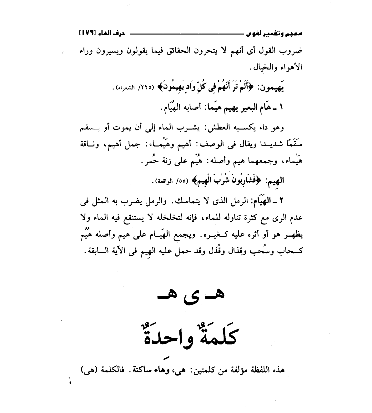 2 - الهيام: الرمل الذي لا يتماسك والرمل يضرب به المثل في عدم الري مع كثرة تناوله للماء، فإنه لتخلخله لا يستنفع فيه الماء ولا يظهر هو أو أثره عليه كغيره. ويجمع الهيام علي هيم وأصله هيم كسحاب وسحب وقذاك وقذل وقد حمل عليه الهيم في الآية السابقة.