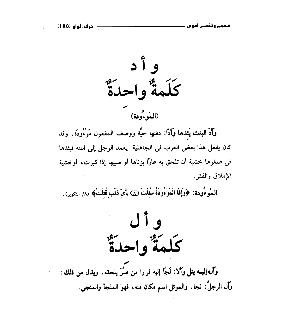 الموءودة: (وَإِذَا الْمَوْءُودَةُ سُئِلَتْ (8) بِأَيِّ ذَنْبٍ قُتِلَتْ) "8/التكوير "
