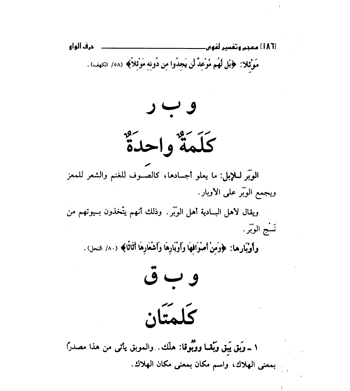 1 - وبق يبق وبقا ووبوقا: هلك والموبق يأتي من هذا مصدرا بمعني الهلاك، واسم مكان بمعني مكان الهلاك.