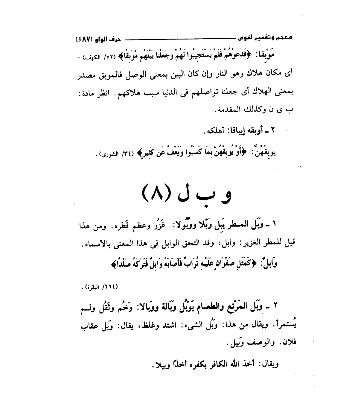 1 - وبل المطر يبل وبلا ووبولا: غزر وعظم قطره. ومن هذا قيل للمطر الغزير: وابل، وقد التحق الوابل في هذا المعني بالأسماء والي: (كَمَثَلِ صَفْوَانٍ عَلَيْهِ تُرَابٌ فَأَصَابَهُ وَابِلٌ فَتَرَكَهُ صَلْداً) " 264/البقرة ".
