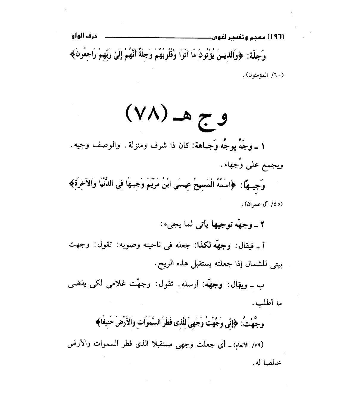 1 - وجه يوجه وجاهة: كان ذا شرف ومنزلة. والوصف وجيه ويجمع علي وجهاء.