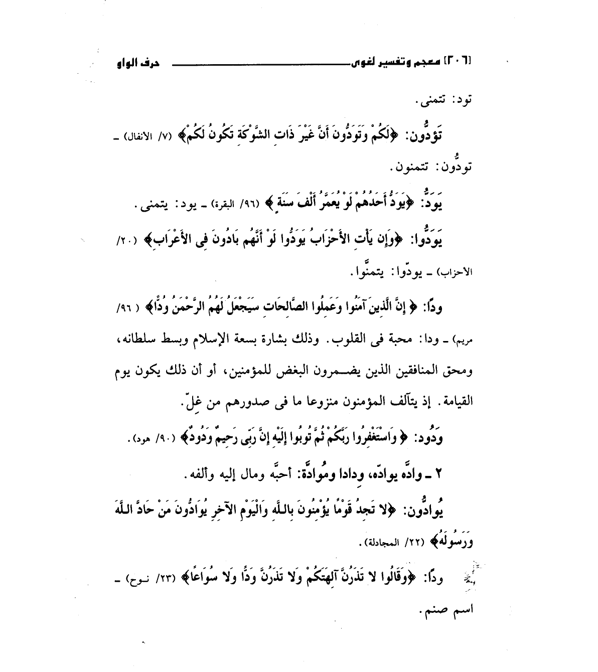 يود: (يَوَدُّ أَحَدُهُمْ لَوْ يُعَمَّرُ أَلْفَ سَنَةٍ) " 96/البقرة " يود يتمني يودوا: (وَإِنْ يَأْتِ الأَحْزَابُ يَوَدُّوا لَوْ أَنَّهُمْ بَادُونَ فِي الأَعْرَابِ) " 20/الأحزاب " - يودوا: يتمنوا.