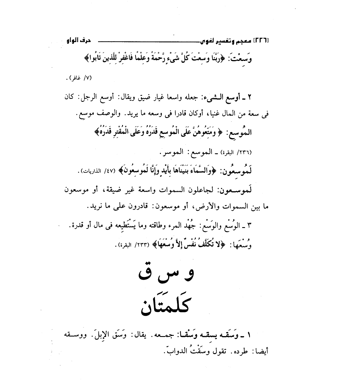 الموسع: (وَمَتِّعُوهُنَّ عَلَى الْمُوسِعِ قَدَرُهُ وَعَلَى الْمُقْتِرِ قَدَرُهُ) "236/البقرة" الموسع: الموسر