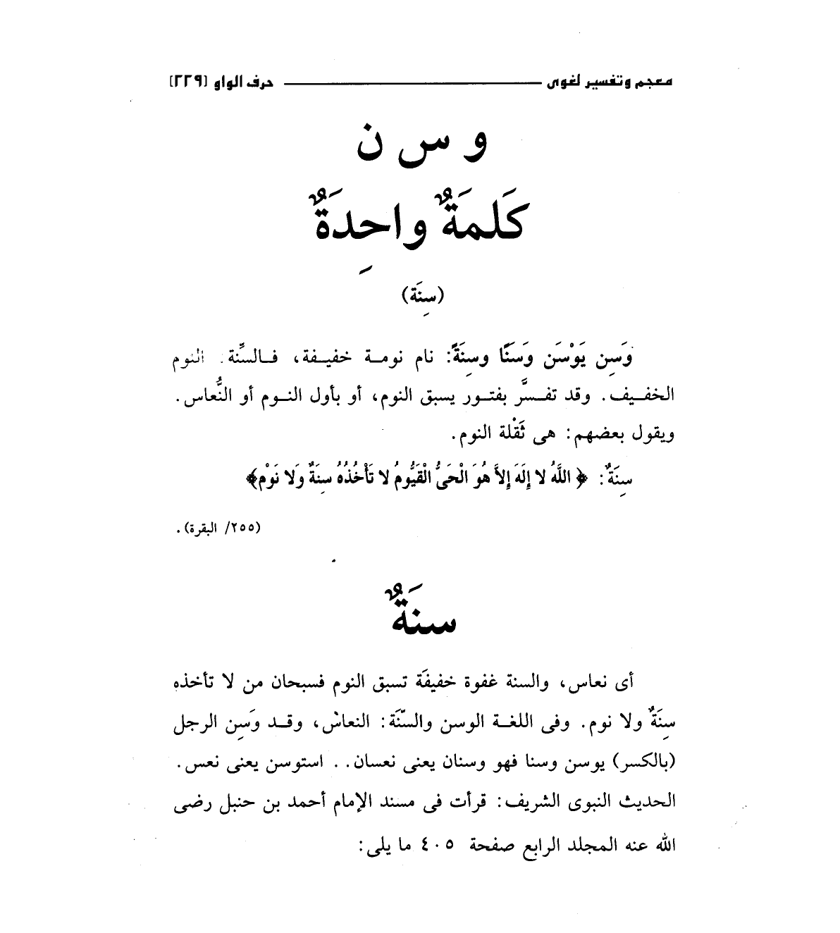 أي نعاس، والسنة غفوة خفيفة تسبق النوم فسبحان من لا تأخذه سنة ولا نوم وفي اللغة الوسن والسنة: النعاس، وقد وسن الرجل (بالكسر) يوسن وسنا فهو وسنان يعني نعسان استوسن يعني نعس الحديث النبوي الشريف: قرآت في مسند الإمام أحمد بن حنبل رضي الله عنه المجلد الرابع صفحة 405 ما يلي: