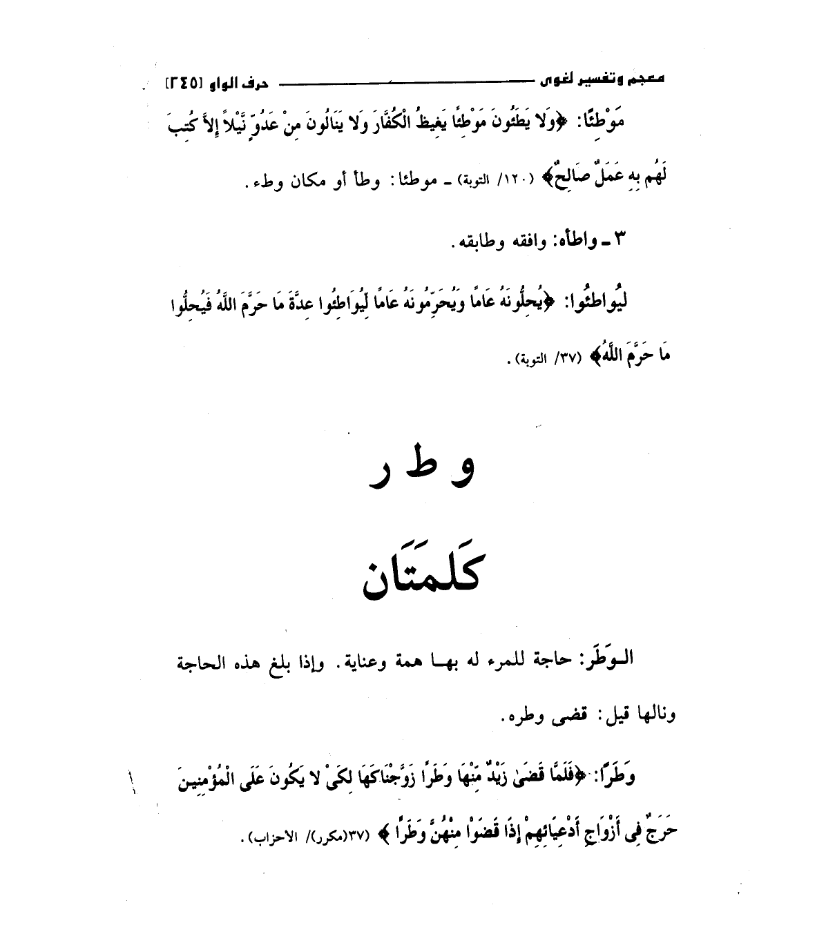 وطرا: (فَلَمَّا قَضَى زَيْدٌ مِنْهَا وَطَراً زَوَّجْنَاكَهَا لِكَيْ لا يَكُونَ عَلَى الْمُؤْمِنِينَ حَرَجٌ فِي أَزْوَاجِ أَدْعِيَائِهِمْ إِذَا قَضَوْا مِنْهُنَّ وَطَراً) " 37 مكرر/الأحزاب ".