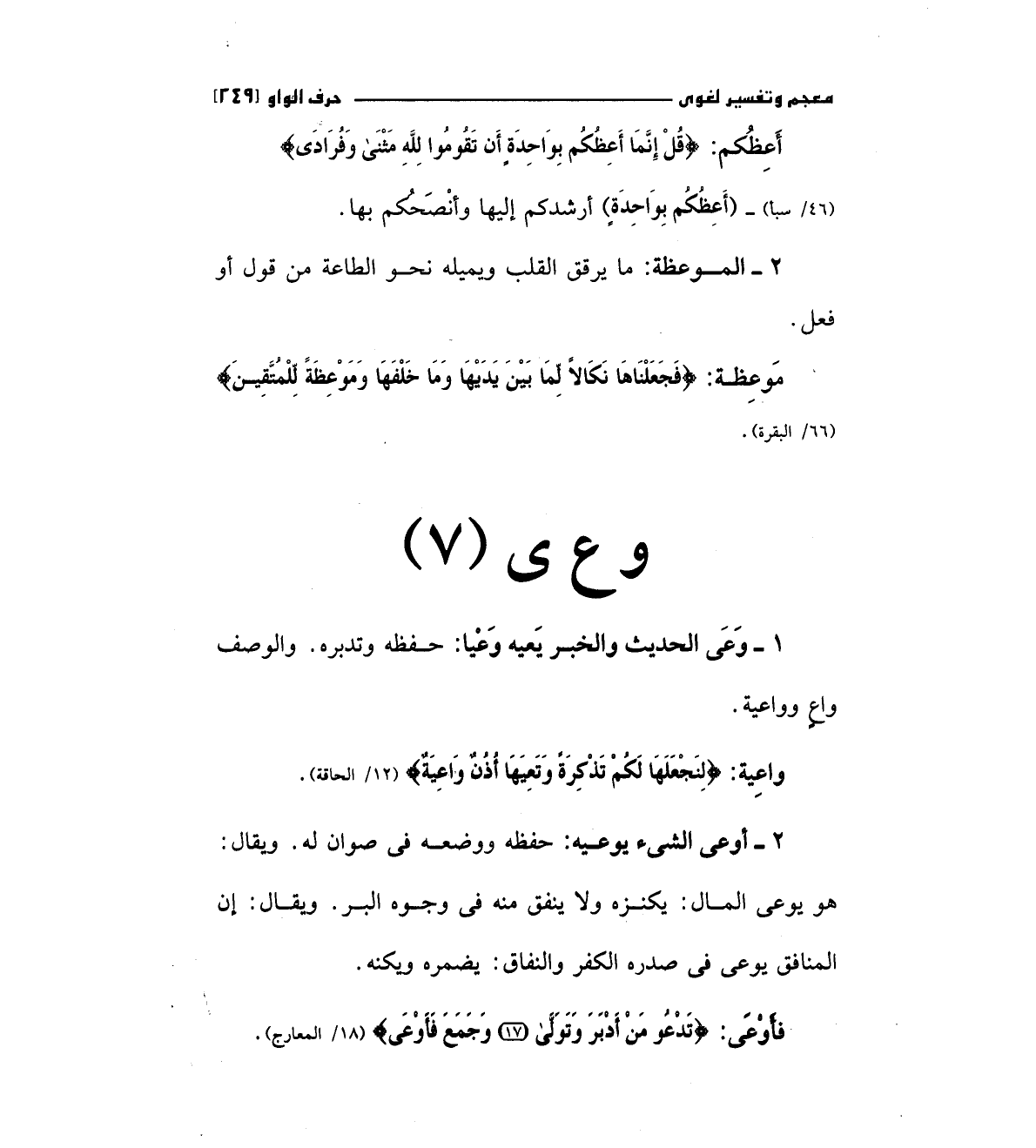 1 - وعي الحديث والخبر يعيه وعيا: حفظه وتدبره والوصف واع وواعية