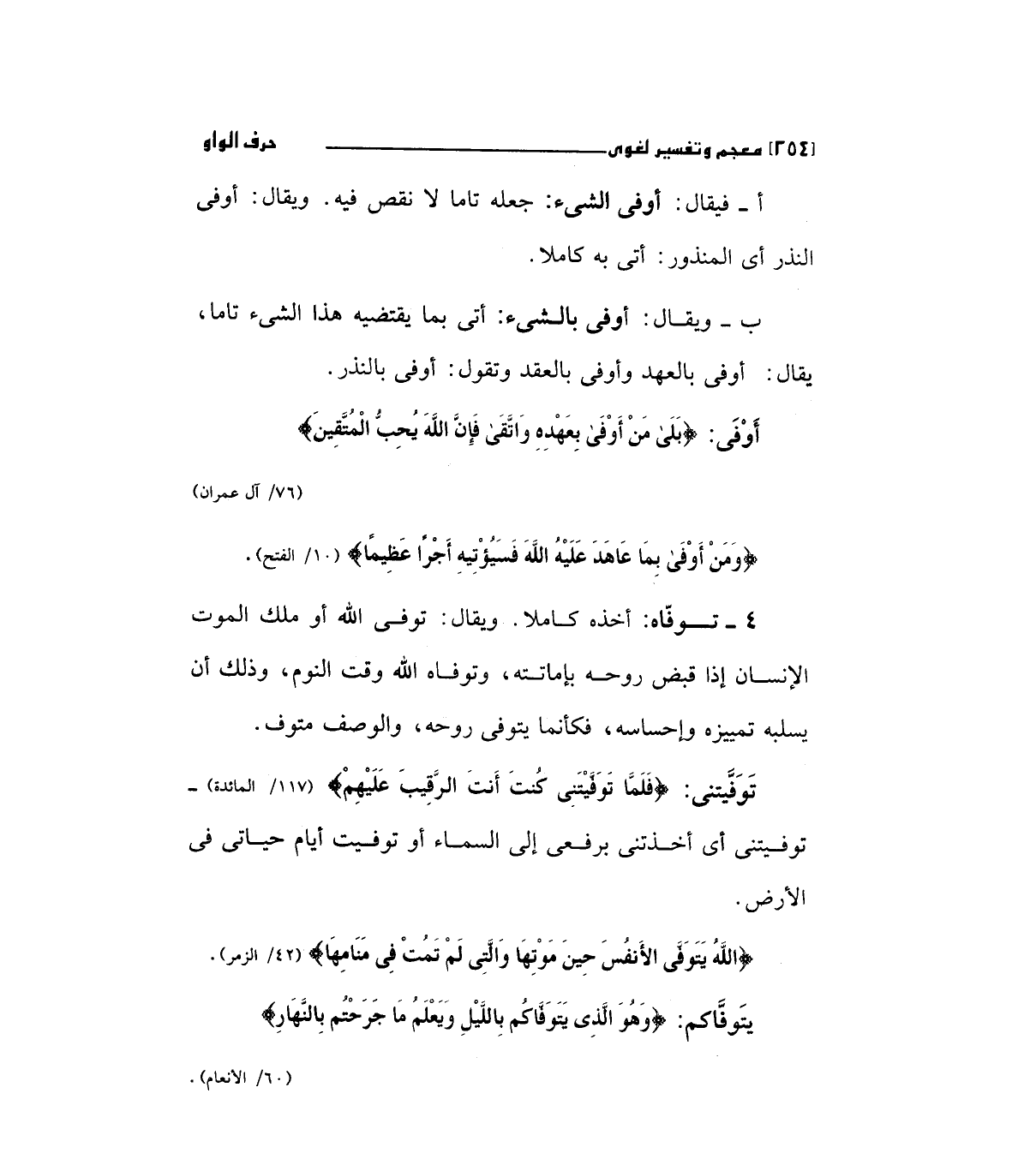 أ- فيقال: أوفي الشئ: جعله تاما لا نقص فيه ويقال أوفي النذر أي المنذور: أتي به كاملا.
