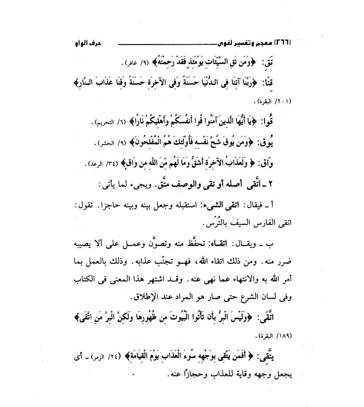 ب- ويقال: اتقاه تحفظ منه وتصون وعمل علي إلا يصيبه ضرر منه ومن ذلك اتقاء الله، فهو تجنب عذابه وذلك بالعمل بما أمر الله به والانتهاء عما نهي عنه وقد اشتهر هذا المعني في الكتاب وفي لسان الشرع حتي صار هو المراد عند الإطلاق.